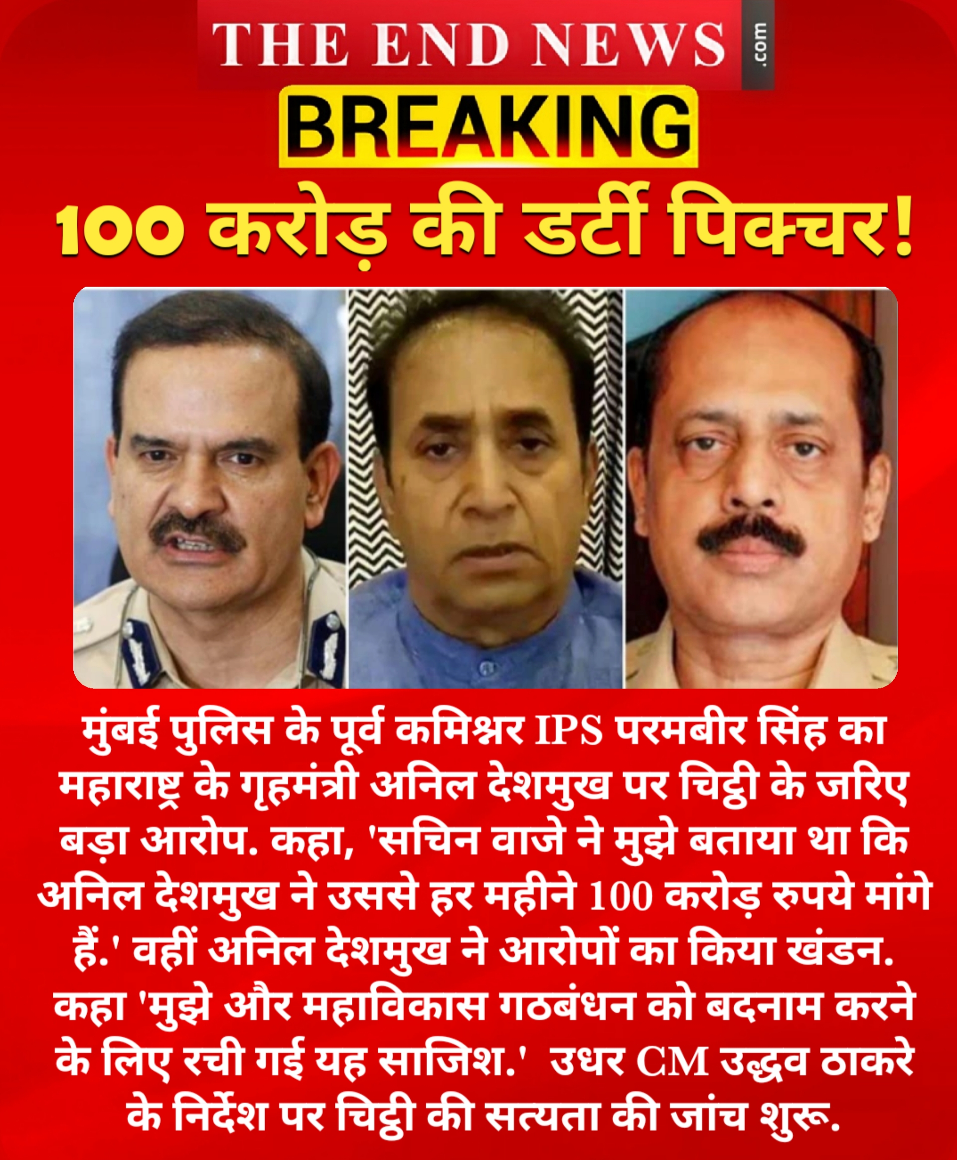 बता दें कि हाल ही में परमबीर सिंह को मुंबई के पुलिस कमिश्नर पद से हटाया गया था. परमबीर सिंह ने चिट्ठी में लिखा कि सचिन वाजे ने मुझे बताया था कि अनिल देशमुख ने उससे हर महीने 100 करोड़ रुपये मांगे हैं. उधर मुंबई पुलिस कमिश्नर रहे परमबीर सिंह के इन आरोपों को महाराष्ट्र के गृहमंत्री ने सिरे से नकार दिया है.