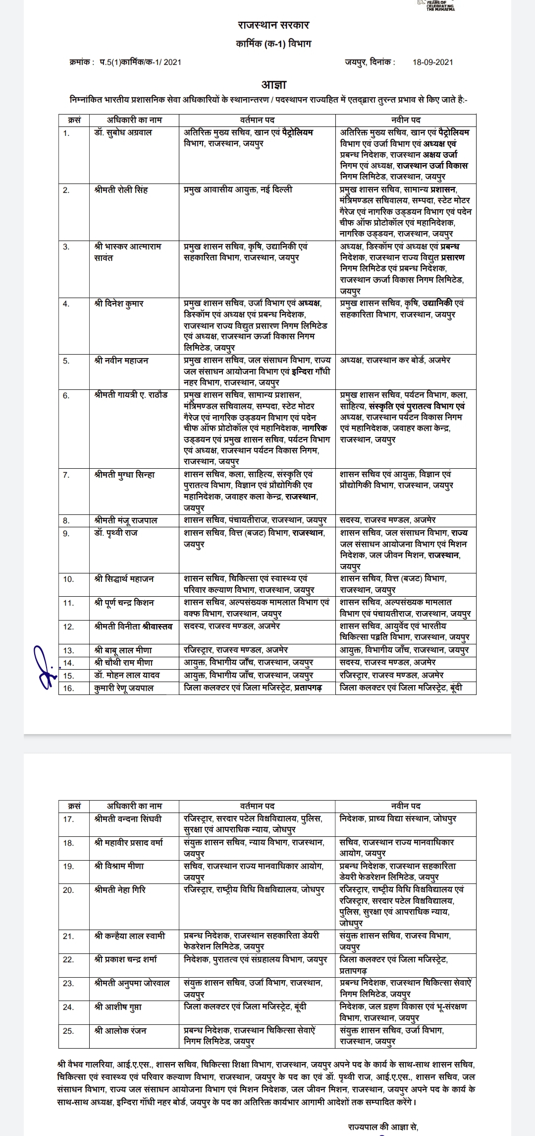 जयपुर। राजस्थान में देर रात 12:00 बजे के बाद दो घटनाक्रम अचानक चर्चा में आ गए। एक मुख्यमंत्री अशोक गहलोत के OSD लोकेश शर्मा का अपने पद से इस्तीफा देना और दूसरा राजस्थान में 25 आईएएस अधिकारियों के तबादलों की लिस्ट। राजस्थान में बिजली संकट के बीच ऊर्जा विभाग में प्रमुख सचिव पद की जिम्मेदारी संभाल रहे दिनेश कुमार को यहां से हटा दिया गया। दिनेश कुमार के पास डिस्कॉम चेयरमैन की जिम्मेदारी भी थी। अब सुबोध अग्रवाल को ऊर्जा विभाग के अतिरिक्त मुख्य सचिव-ACS की जिम्मेदारी सौंपी गई है। वरिष्ठ आईएएस भास्कर आत्माराम सावंत को डिस्कॉम चेयरमैन के साथ-साथ राजस्थान राज्य विद्युत प्रसारण निगम लिमिटेड के सीएमडी की जिम्मेदारी सौंप दी गई है। सुबोध अग्रवाल अब तक खान एवं पेट्रोलियम के एसीएस की जिम्मेदारी संभाल रहे थे, उन्हें अब ऊर्जा की जिम्मेदारी भी सौंप दी गई है।