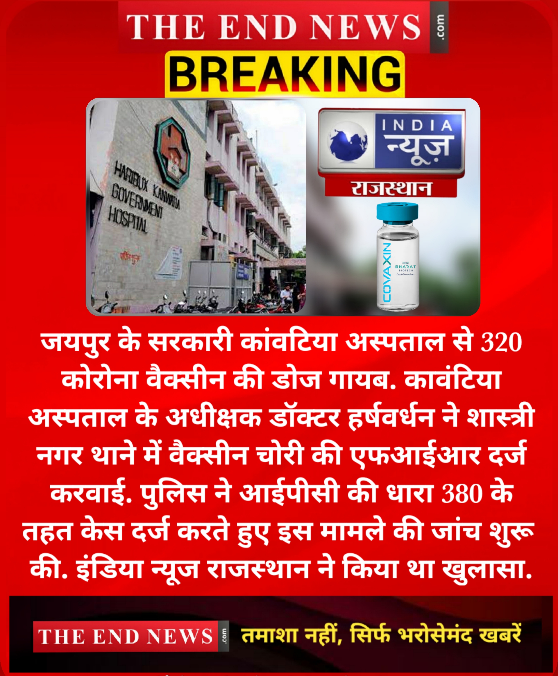 कावंटिया अस्पताल के अधीक्षक डॉक्टर हर्षवर्धन ने शास्त्री नगर थाने में वैक्सीन चोरी की एफआईआर दर्ज करवाई है. पुलिस ने आईपीसी की धारा 380 के तहत केस दर्ज करते हुए इस मामले की जांच शुरू कर दी है. बता दें कि इस मामले का खुलासा राजस्थान के प्रमुख रीजनल न्यूज चैनल इंडिया न्यूज राजस्थान ने किया था.