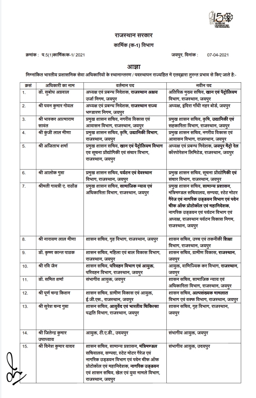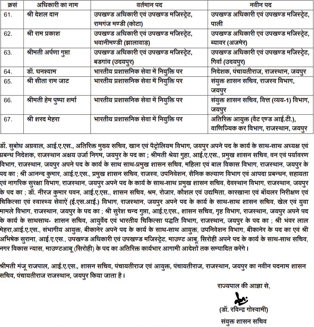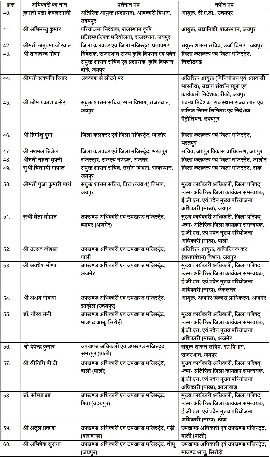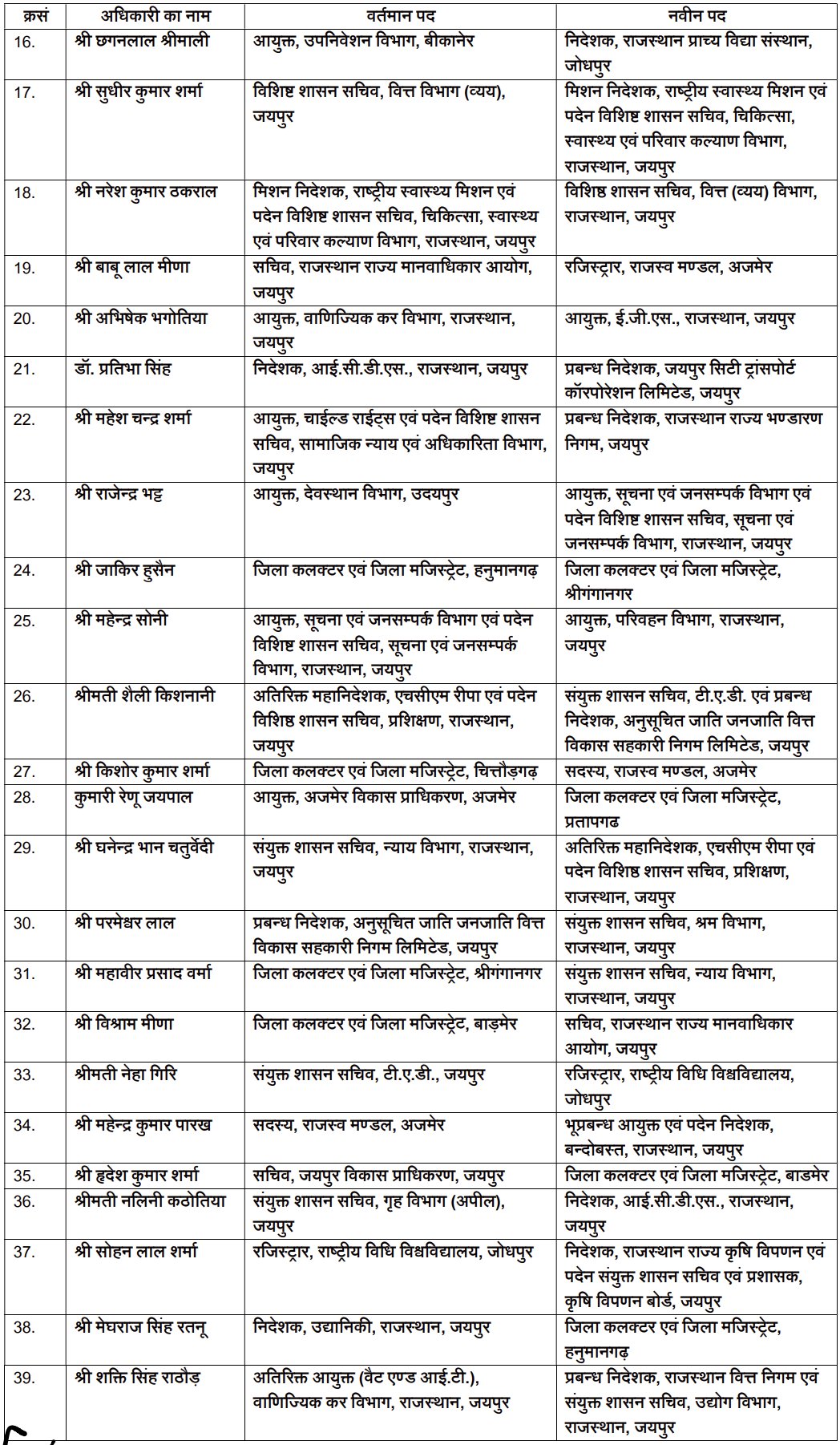 टोंक,प्रतापगढ़, जालौर, हनुमानगढ़, श्रीगंगानगर, चित्तौड़, बाड़मेर और भरतपुर 8 जिलों के कलेक्टर, जयपुर और उदयपुर के संभागीय आयुक्त को बदला गया है। राजेंद्र भट्ट को आयुक्त सूचना एवं जनसंपर्क विभाग लगाया है।