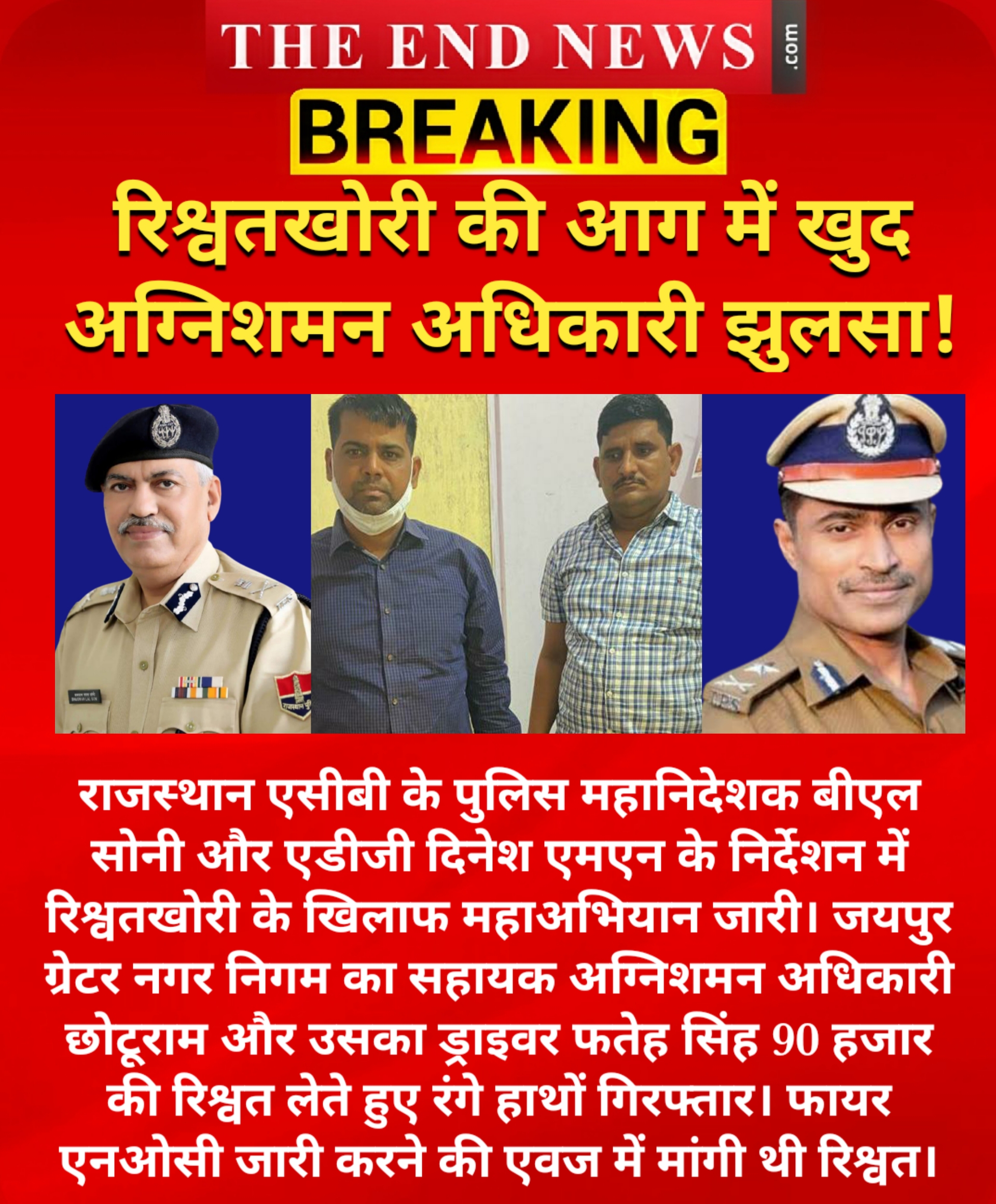 राजस्थान एसीबी के पुलिस महानिदेशक बीएल सोनी के निर्देशन में एडीजी दिनेश एमएन ने इस पूरी कार्रवाई को अंजाम दिया। फायर एनओसी जारी करने की एवज में यह रिश्वत ली थी।