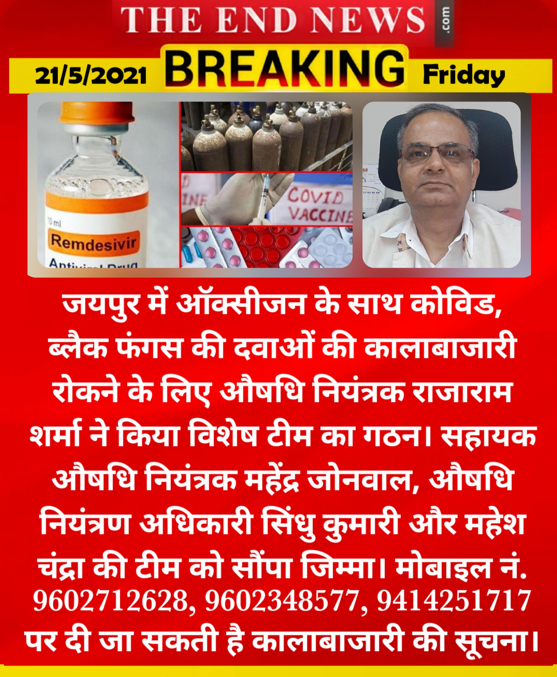 उधर जयपुर में ऑक्सीजन के साथ कोविड, ब्लैक फंगस की दवाओं की कालाबाजारी रोकने के लिए औषधि नियंत्रक राजाराम शर्मा ने विशेष टीम का गठन किया। सहायक औषधि नियंत्रक महेंद्र जोनवाल, औषधि नियंत्रण अधिकारी सिंधु कुमारी और महेश चंद्रा की टीम को जिम्मा सौंपा। मोबाइल नं. 9602712628, 9602348577, 9414251717 पर कालाबाजारी की सूचना दी जा सकती है।