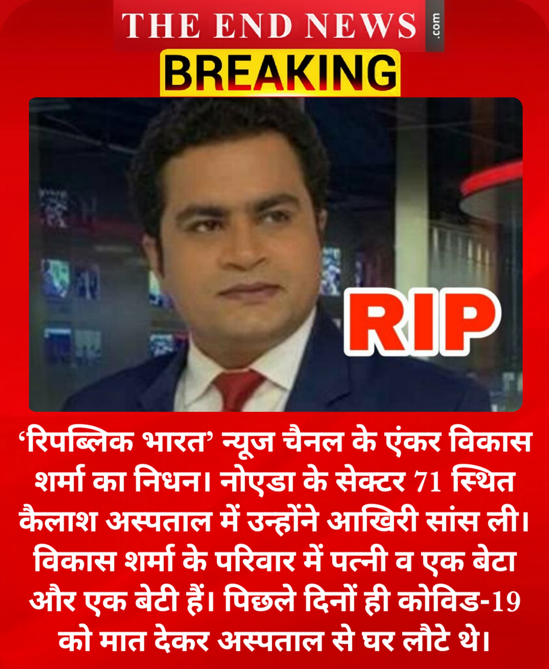 नोएडा.‘रिपब्लिक भारत’ न्यूज चैनल के एंकर विकास शर्मा का निधन हो गया है। नोएडा के सेक्टर 71 स्थित कैलाश अस्पताल में उन्होंने आखिरी सांस ली। विकास शर्मा के परिवार में पत्नी व एक बेटा और एक बेटी हैं। पिछले दिनों ही कोविड-19 को मात देकर अस्पताल से घर लौटे थे। उन्हें तीन दिन पहले ही बुखार हुआ था और तबियत खराब होने पर उन्हें वापस अस्पताल में भर्ती कराया गया था। बता दें कि विकास शर्मा लंबे समय से मीडिया में कार्यरत थे। विकास शर्मा ने रिपब्लिक भारत में अपनी खास पहचान बनाई थी और सुशांत सिंह राजपूत की मौत के दौरान उनकी एंकरिंग और रिपोर्टिंग खासी चर्चा में रही थी।