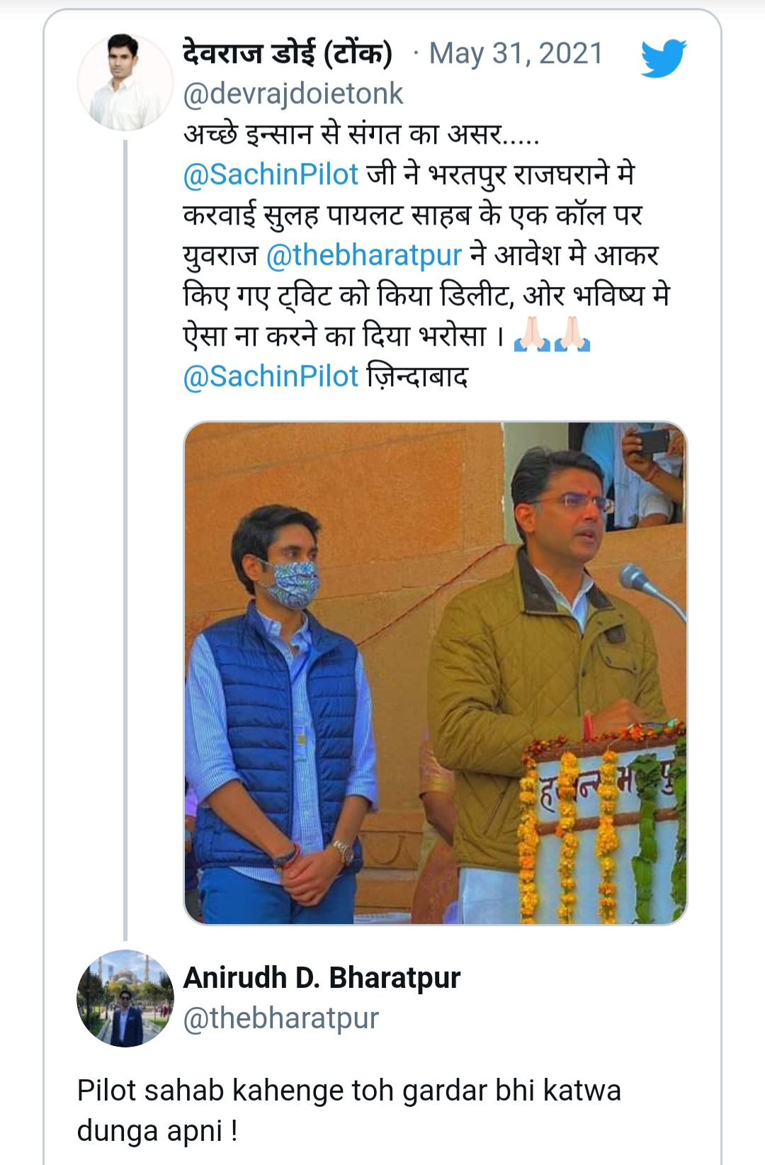 इस बात को बल एक ट्वीट के जरिए मिला। दरअसल टोंक से पायलट समर्थक युवा नेता देवराज डॉई ने ट्वीट कर लिखा कि अच्छे इंसान से संगत का असर, सचिन पायलट ने भरतपुर राजघराने में सुलह करवाई। पायलट साहब के एक कॉल पर अनिरुद्ध सिंह ने आवेश मे आकर किए गए ट्वीट को डिलीट किये और भविष्य मे ऐसा नहीं करने का भरोसा दिया।'