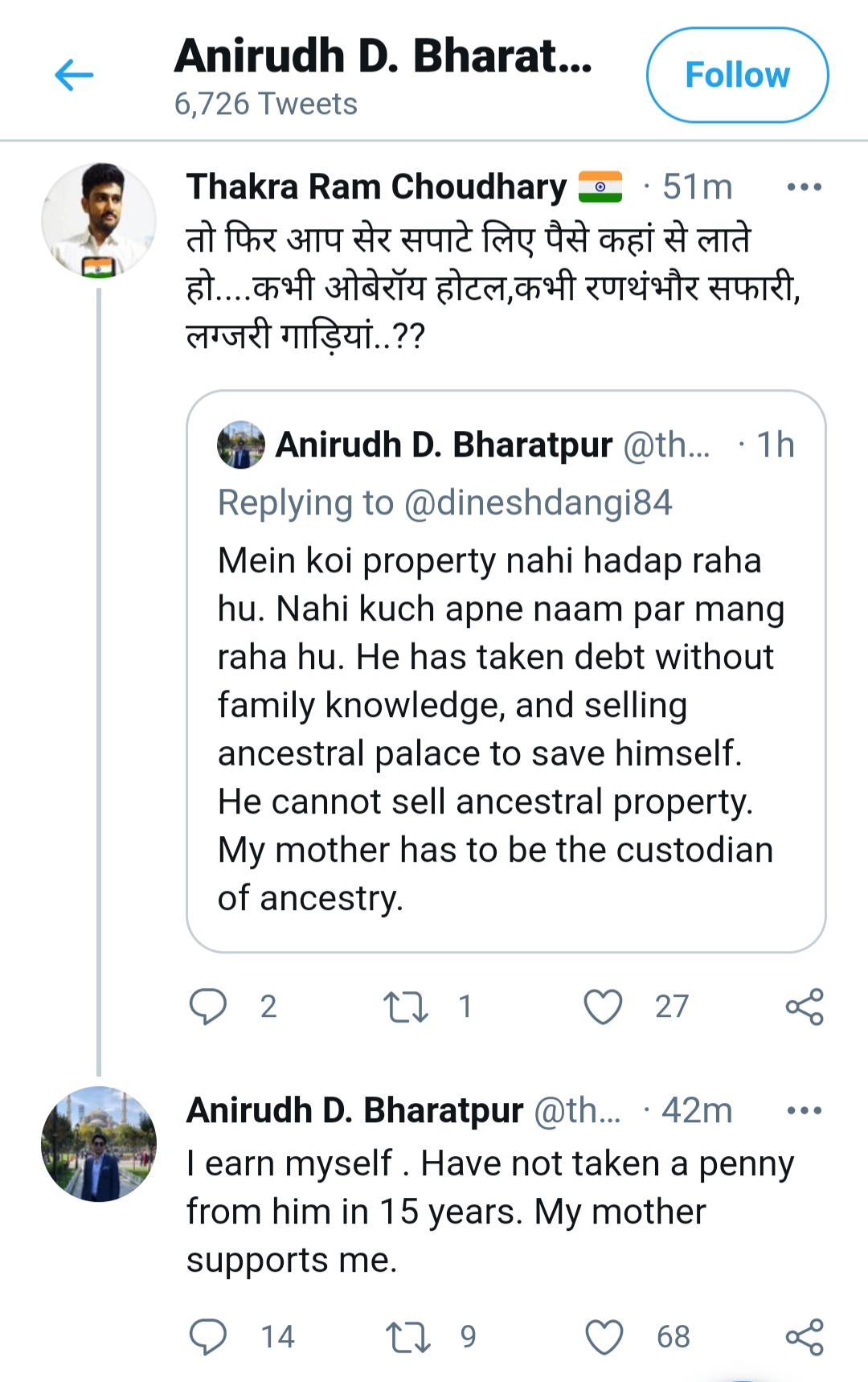 उधर अनिरुद्ध सिंह ने इस विवाद के बाद कई रिट्वीट्स के जरिए सफाई भी दी है। क्योंकि विश्वेंद्र सिंह के समर्थक लगातार अनिरुद्ध सिंह के इस कदम की आलोचना कर रहे हैं। और उनके इस व्यवहार पर सवाल भी उठा रहे हैं। ट्विटर पर एक सवाल के जवाब में अनिरुद्ध सिंह ने लिखा कि उन्होंने पिछले 15 साल से अपने पिता से ₹1 की भी मदद नहीं ली, उनकी मां ने हर वक्त उनकी मदद की।