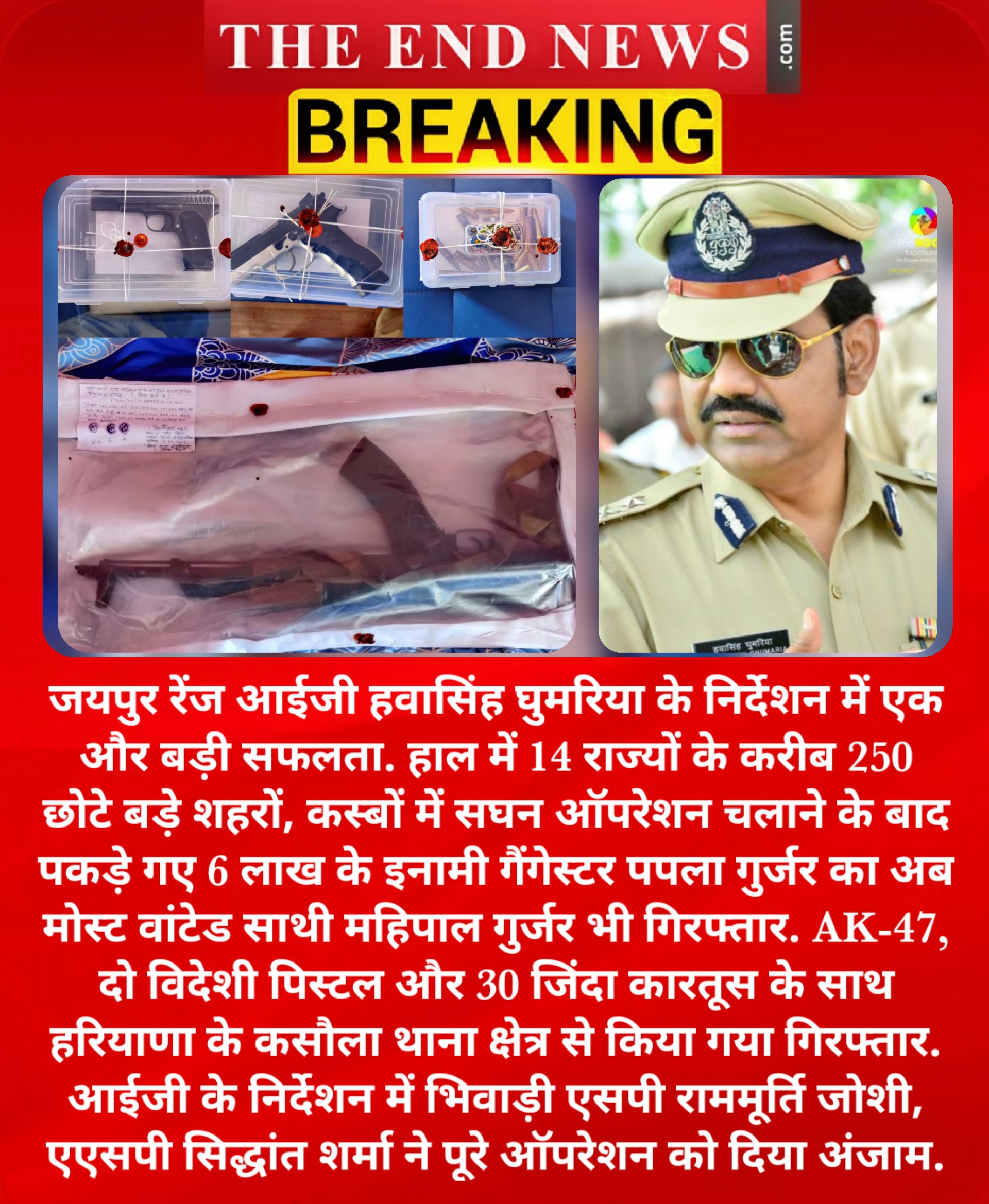 हवासिंह घुमरिया के मुताबिक भिवाड़ी एसपी राममूर्ति जोशी के पर्यवेक्षण में एएसपी राजेन्द्र सिंह सिसोदिया और सिद्धांत शर्मा ने इस आपरेशन में महत्वपूर्ण भूमिका निभाई जिसके बाद महिपाल को गिरफ्तार कर उससे हथियार बरामद कर लिए गए.उसे हरियाणा के कसौल से एक खण्डरनुमा मकान से गिरफ्तार किया गया है.