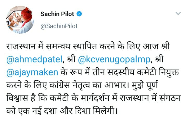 कांग्रेस द्वारा राजस्थान में राजनीतिक मुद्दों के लिए 3 सदस्यीय कमेटी का भी गठन किया है. इस कमेटी में वरिष्ठ कांग्रेसी नेता अहमद पटेल (Ahmad Patel), राजस्थान कांग्रेस के प्रभारी अजय माकन और अखिल भारतीय कांग्रेस कमेटी (AICC) के संगठन महासचिव इंजार्ज केसी वेणुगोपाल (KC Venugopal) को कमेटी का सदस्य बनाया है.