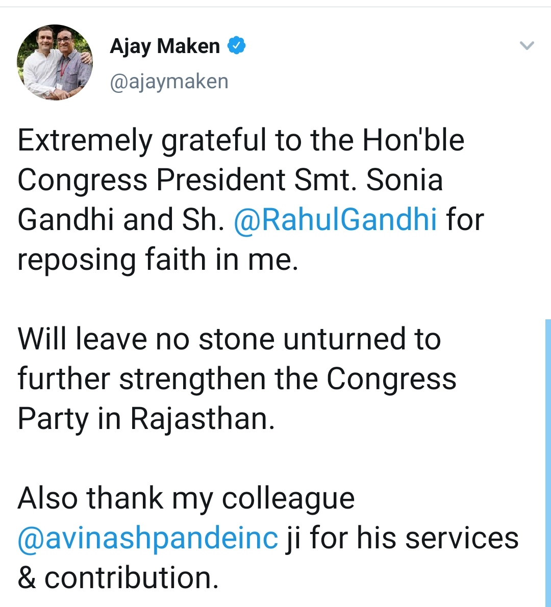 उधर सचिन पायलट ने भी अजय माकन को प्रभारी महासचिव बनाए जाने पर बधाई दी ट्वीट कर लिखा, 'अजय माकन जी को राजस्थान प्रभारी महासचिव नियुक्त किए जाने पर हार्दिक बधाई. आपकी नियुक्ति से निश्चित ही राजस्थान कांग्रेस के कार्यकर्ताओं की उम्मीदों को बल मिलेगा. उज्ज्वल भविष्य की कामना के साथ मैं अजय माकन जी का वीर भूमि राजस्थान में स्वागत भी करता हूं.'