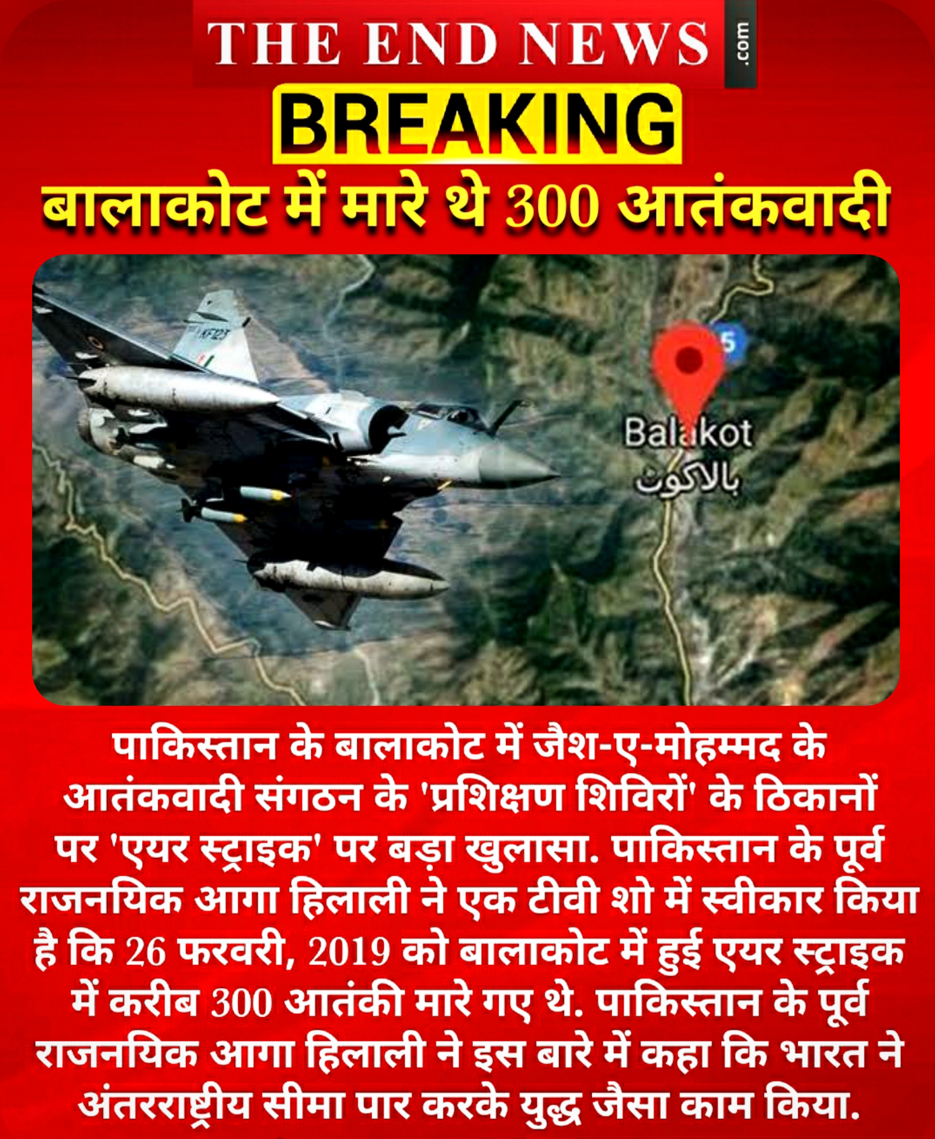 इस्लामाबाद/ नई दिल्ली. 26 फरवरी, 2019 को बालाकोट में हुई एयर स्ट्राइक में करीब 300 आतंकी मारे गए थे. पाकिस्तान के बालाकोट में जैश-ए-मोहम्मद नामक आतंकवादी संगठन के 'प्रशिक्षण शिविरों' के ठिकानों पर 'एयर स्ट्राइक' पर बड़ा खुलासा हुआ है. पाकिस्तान के पूर्व राजनयिक आगा हिलाली ने यह खुलासा एक टीवी शो के दौरान किया. उन्होंने स्वीकार किया कि 26 फरवरी, 2019 को बालाकोट में हुई एयर स्ट्राइक में करीब 300 आतंकी मारे गए थे. पाकिस्तान के पूर्व राजनयिक आगा हिलाली ने इस बारे में कहा कि भारत ने अंतरराष्ट्रीय सीमा पार करके युद्ध जैसा काम किया. लेकिन हमारा लक्ष्य उनसे अलग था. हमने उनके बड़े अधिकारियों को निशाना बनाया.