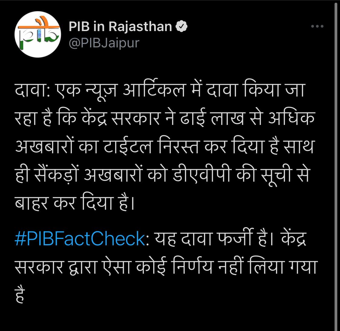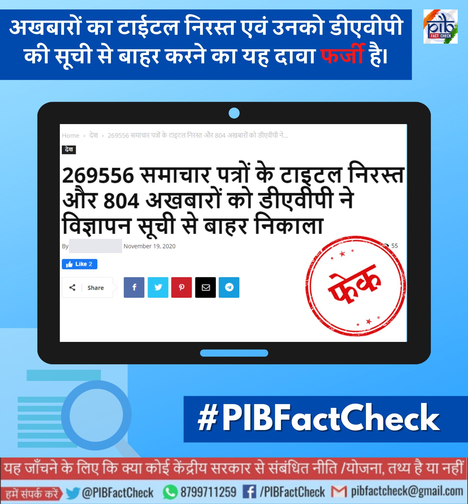 नई दिल्ली. भारत सरकार द्वारा ढाई लाख से ज्यादा अखबारों के टाइटल निरस्त करने और सैकड़ों अखबारों को डीएवीपी से मिलने वाले विज्ञापनों की सूची से बाहर निकालने की खबर सही नहीं है. राजस्थान पीआईबी फैक्ट चेक टीम ने इस खबर को गलत पाया है. कुछ मीडिया से जुड़ी वेबसाइट्स ने इस बात का खुलासा करते हुए इसे प्राथमिकता के साथ चलाया था. जिसके बाद इसी को आधार बनाकर देश भर की मीडिया जगत में इस खबर को प्राथमिकता के साथ प्रसारित किया गया और चलाया गया. लेकिन जैसे ही सूचना पीआईबी तक पहुंची तो इस खबर में स्पष्टीकरण देते हुए कहा गया कि ऐसा कोई फैसला नहीं हुआ है. इस तरह की खबरें भी गलत है.