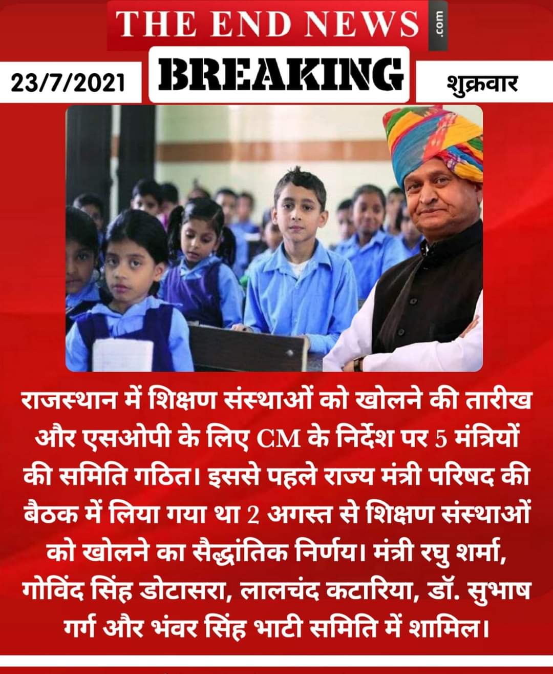 गहलोत ने शुक्रवार को मुख्यमंत्री निवास पर वीडियो काॅन्फ्रेंस के जरिए हुई बैठक में कहा कि इस समिति में चिकित्सा एवं स्वास्थ्य मंत्री डाॅ. रघु शर्मा, कृषि मंत्री लालचंद कटारिया, शिक्षा राज्यमंत्री गोविंद सिंह डोटासरा, उच्च शिक्षा राज्यमंत्री भंवर सिंह भाटी तथा चिकित्सा एवं तकनीकी शिक्षा राज्यमंत्री डाॅ. सुभाष गर्ग शामिल होंगे। यह समिति शिक्षण संस्थाओं को खोलने की तारीख एवं इसके लिए विस्तृत एसओपी तैयार करने पर निर्णय करेगी।