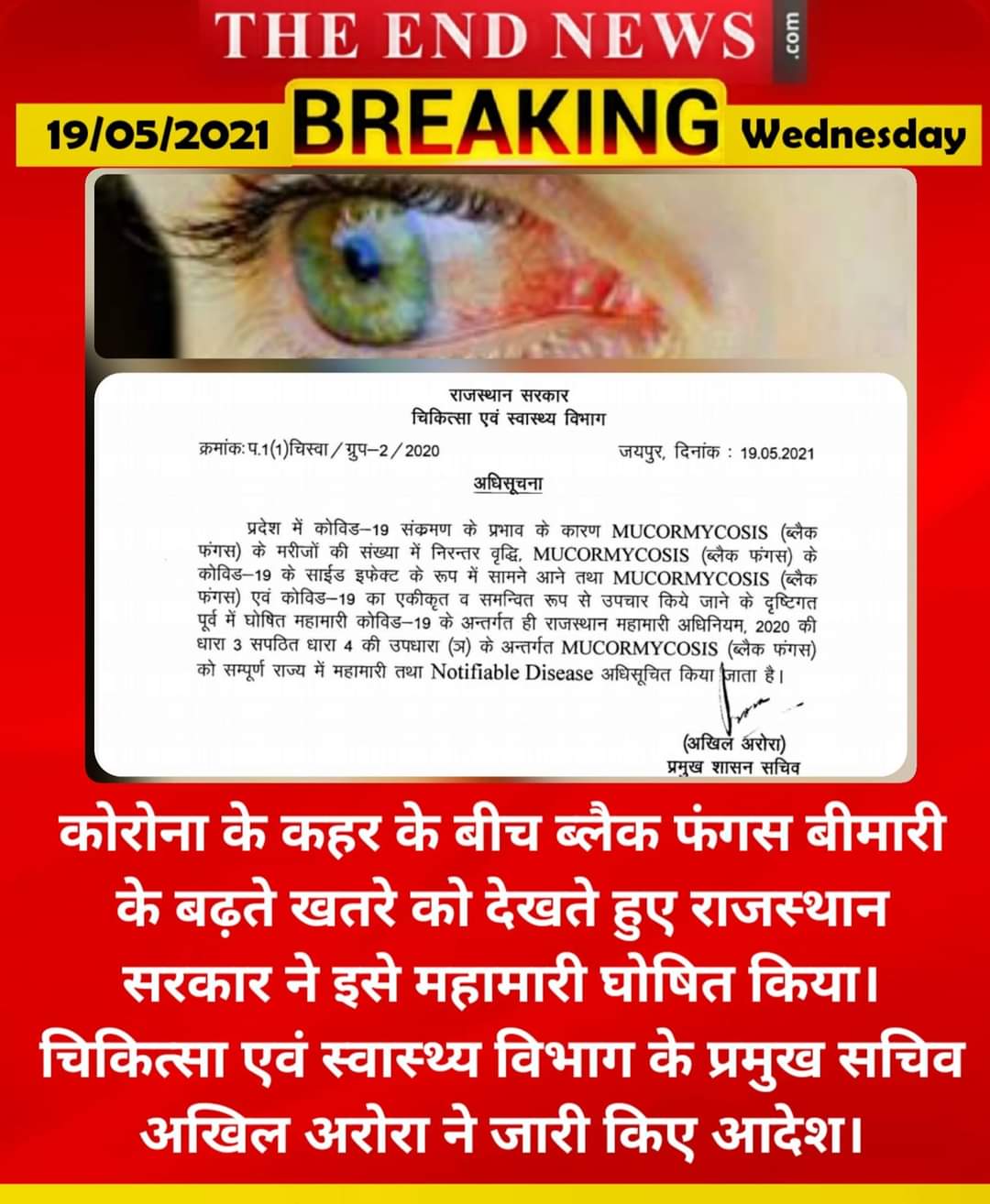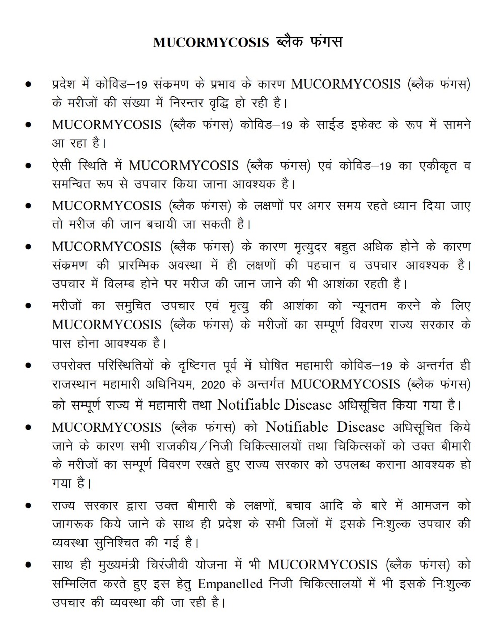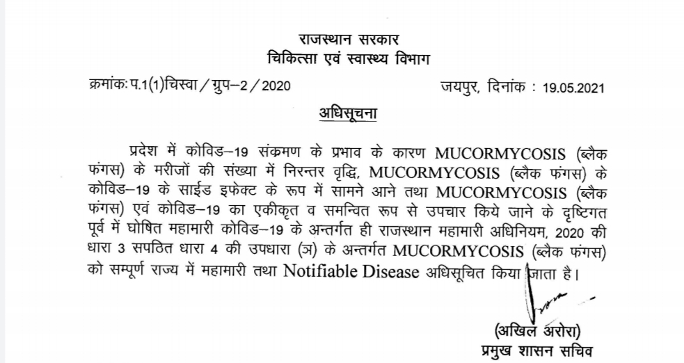 चिकित्सा एवं स्वास्थ्य विभाग के प्रमुख शासन सचिव अखिल अरोड़ा ने बताया कि म्यूकोरमायकोसिस (ब्लैक फंगस) मरीजों की संख्या में निरन्तर वृद्धि और कोरोना के साइड इफेक्ट के रूप में सामने आने तथा ब्लैक फंगस एवं कोविड का एकीकृत व समन्वित रूप से उपचार किए जाने के चलते पूर्व में घोषित महामारी कोविड-19 के अन्तर्गत ही राजस्थान महामारी अधिनियम के तहत (ब्लैक फंगस) को सम्पूर्ण राज्य में महामारी तथा नोटिफाएबल बीमारी घोषित कर दी है।