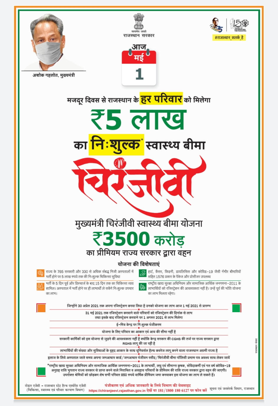 CM ने कहा कि प्रदेशवासियों को स्वास्थ्य का अधिकार देने की दिशा में हमने चिरंजीवी योजना लागू की है। अन्य राज्य और केन्द्र सरकार भी ऐसी योजना पर विचार कर सकते हैं। इस योजना का लाभ हर राजस्थान वासी तक पहुंचाने के लिए सभी परिवारों का पंजीयन आवश्यक है। इसके लिए पंजीयन की तिथि 30 अप्रेल से बढ़ाकर 31 मई कर दी गई है। लोगों से अपील है कि वे अपने परिवार का पंजीयन आवश्यक रूप से कराएं और अन्य लोगों को योजना की जानकारी देकर पंजीयन के लिए प्रेरित करें और इसमें सहयोग करें।