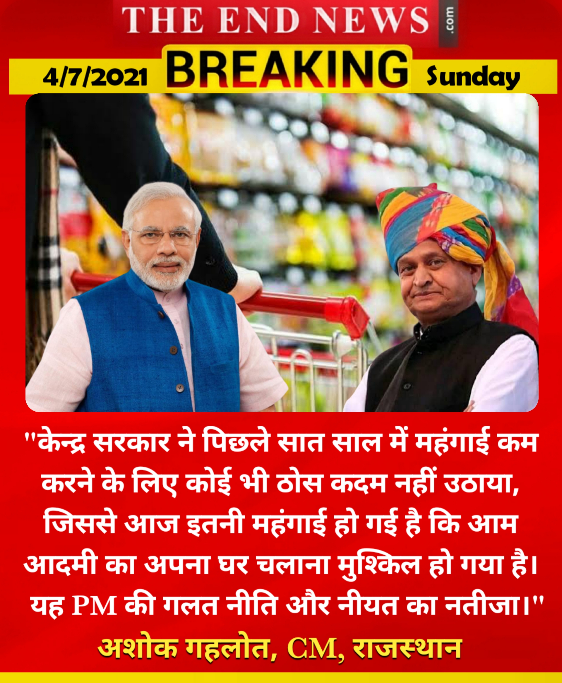 गहलोत ने एक बयान जारी कर कहा कि केन्द्र सरकार ने पिछले सात साल में महंगाई को कम करने के लिए कोई भी ठोस कदम नहीं उठाया जिसके कारण आज इतनी महंगाई हो गई है कि आम आदमी को अपना घर चलाना मुश्किल हो गया है। कोविड के कारण पहले ही सभी की आमदनी कम हुई है एवं बढ़ती महंगाई ने आम आदमी के जेब खर्च का हिसाब बिगाड़ दिया है। यह दिखाता है कि केन्द्र सरकार बुरी तरह असफल हो गई है जिसके पास ना तो सही नीति है और ना ही साफ नीयत है। पेट्रोल, डीजल, रसोई गैस से लेकर रोजमर्रा के इस्तेमाल की सभी चीजें महंगी होती जा रही हैं।