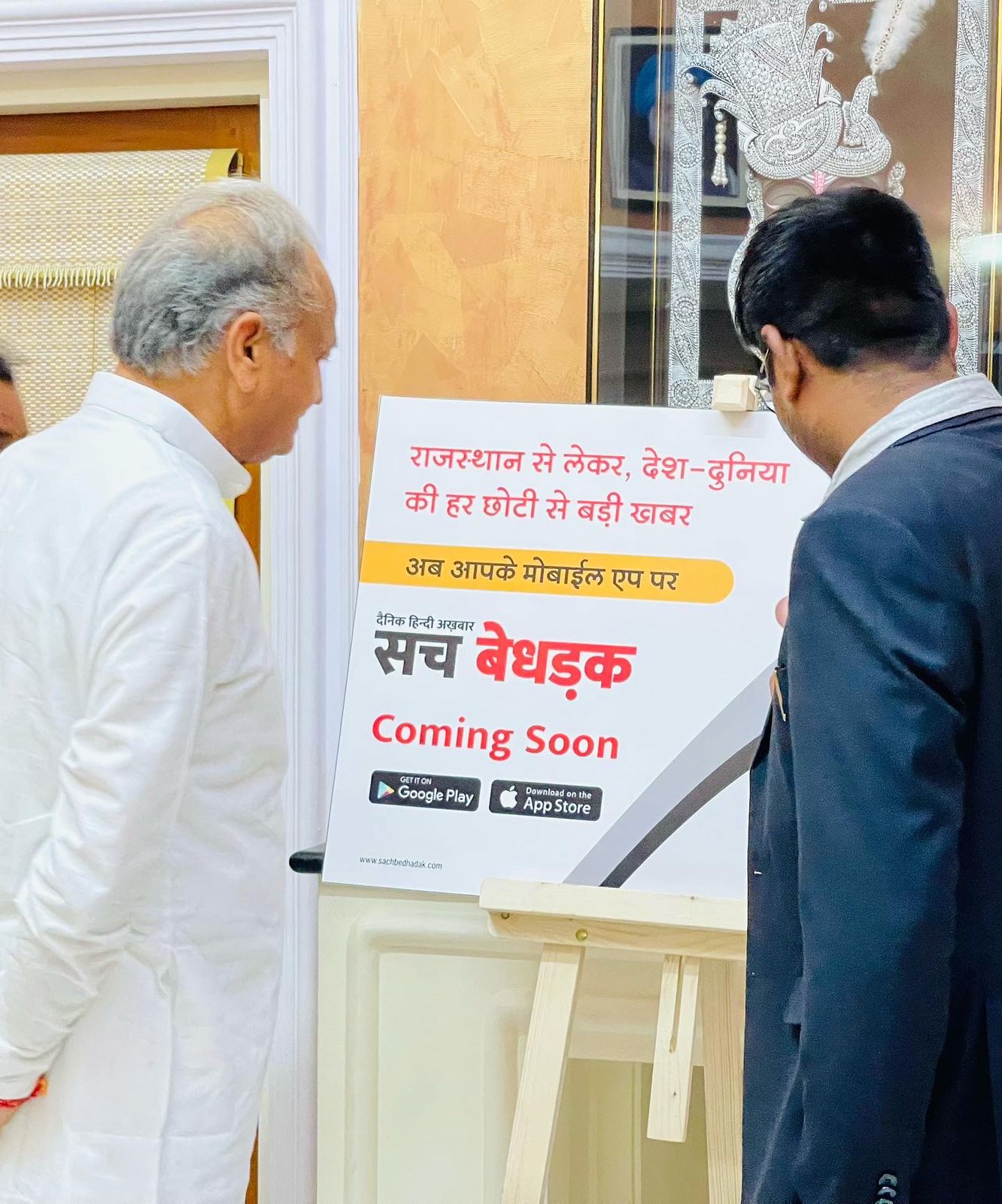 इस मौके पर CM के साथ सच बेधड़क के चेयरमैन विनायक शर्मा और संपादक मनोज माथुर भी मौजूद रहे। मुख्यमंत्री कार्यालय के अधिकारी और सच बेधड़क की मुद्रक एवं प्रकाशक मिताली यादव और डिजिटल हेड रवि कुमार मीणा भी इस लॉन्चिंग कार्यक्रम का हिस्सा बने। यह मोबाइल ऐप 10 दिन में गूगल प्ले स्टोर और एप्पल ऐप स्टोर पर उपलब्ध होगा। मुख्यमंत्री गहलोत ने सच बेधड़क के इस ऐप को चलाकर देखा और चेयरमैन विनायक शर्मा ने इसके फीचर्स की पूरी जानकारी ली। मुख्यमंत्री गहलोत ने सच बेधड़क अखबार एवं मोबाइल ऐप की सराहना की।