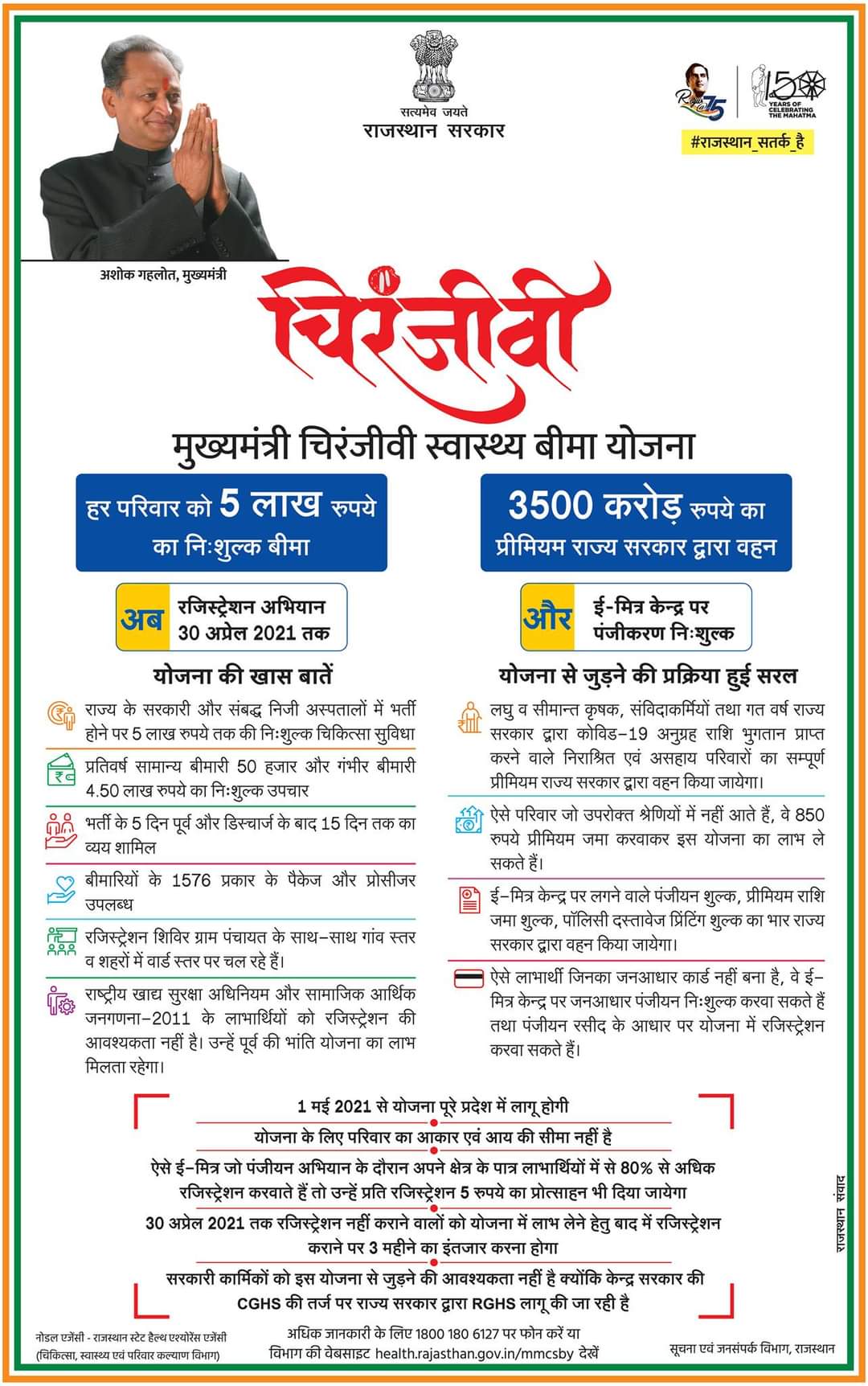 कोरोना संक्रमण को काबू करने के लिए लगाए जन अनुशासन पखवाड़े में रजिस्ट्रेशन करवाने के लिए ई-मित्र केन्द्रों को खुला रखा गया है।' CM ने कहा कि 1 मई से यह योजना लागू हो जाएगी एवं 5 लाख तक का कैशलेस स्वास्थ्य बीमा उपलब्ध होगा। इसमें कोविड-19 का इलाज भी शामिल है। यदि 30 अप्रैल तक रजिस्ट्रेशन नहीं करवाया एवं इसके बाद बीमार हुए तो इलाज का भारी-भरकम खर्च स्वयं ही वहन करना होगा क्योंकि इस योजना में ना आने के कारण बीमा कंपनी आपके इलाज का पेमेंट नहीं करेगी।