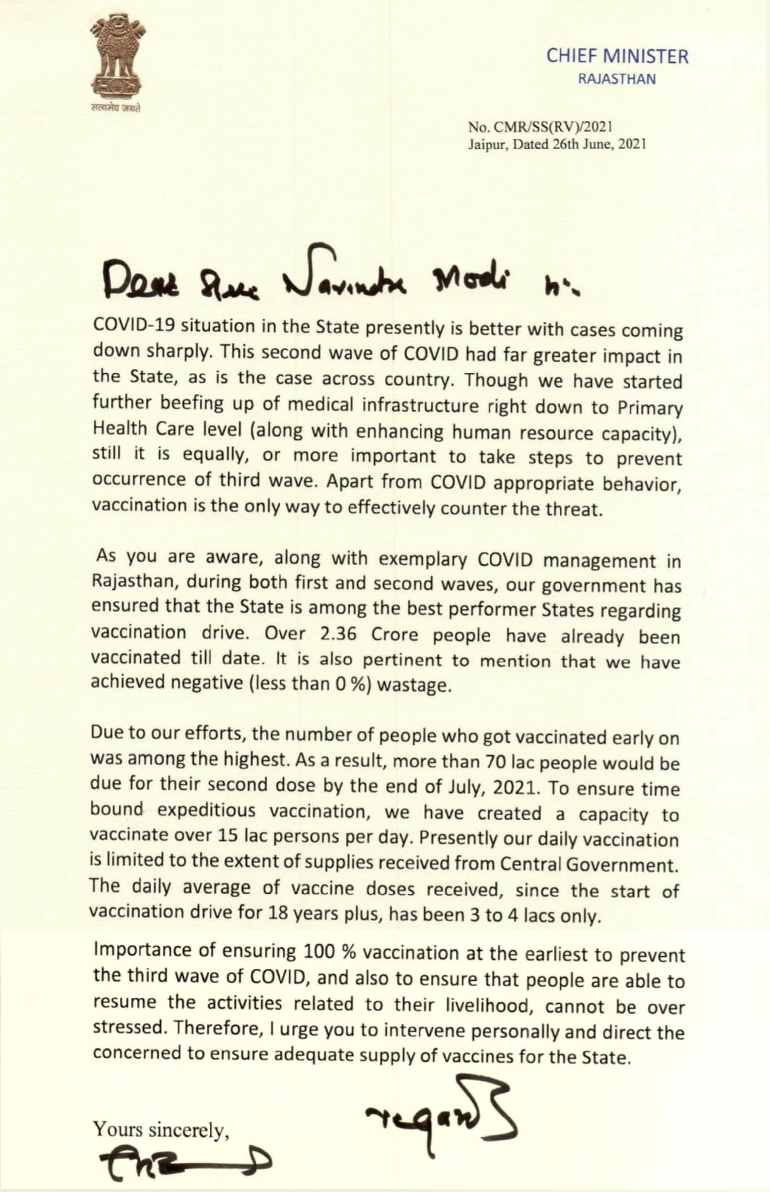 गहलोत ने यह भी लिखा है कि 'COVID की तीसरी लहर को रोकने के लिए जल्द से जल्द 100% टीकाकरण सुनिश्चित किया जाना आवश्यक है. इसलिए मैं आपसे व्यक्तिगत रूप से हस्तक्षेप करने और संबंधितों को राज्य के लिए टीकों की पर्याप्त आपूर्ति सुनिश्चित करने का निर्देश देने का आग्रह करता हूं.'