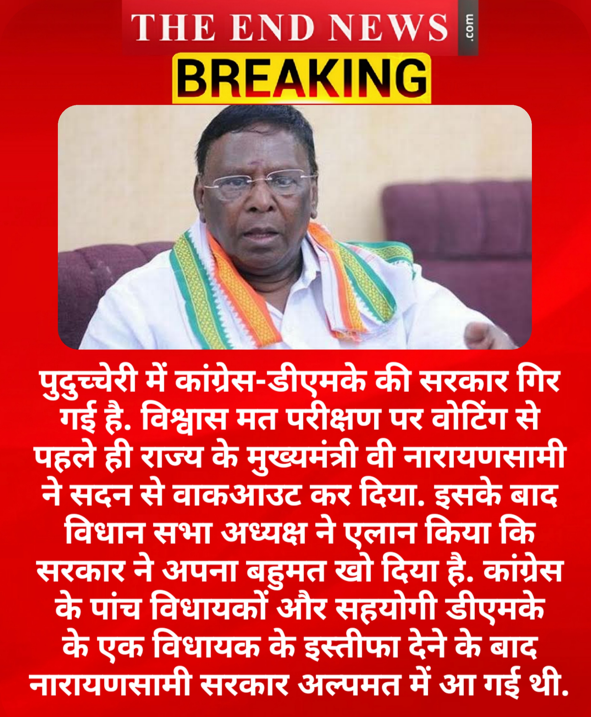 पुदुच्चेरी में कांग्रेस और डीएमके की सरकार गिर गई है. विश्वास मत परीक्षण पर वोटिंग से पहले ही राज्य के मुख्यमंत्री वी नारायणसामी ने सदन से वाकआउट कर दिया, जिससे साफ हो गया था कि वो विश्वास मत खो चुके हैं. इसके बाद विधानसभा अध्यक्ष ने एलान किया कि सरकार ने अपना बहुमत खो दिया है. बता दें कि कांग्रेस के पांच विधायकों और सहयोगी डीएमके के एक विधायक के इस्तीफा देने के बाद नारायणसामी सरकार अल्पमत में आ गई थी, जिसके बाद यह पूरा घटनाक्रम हुआ.