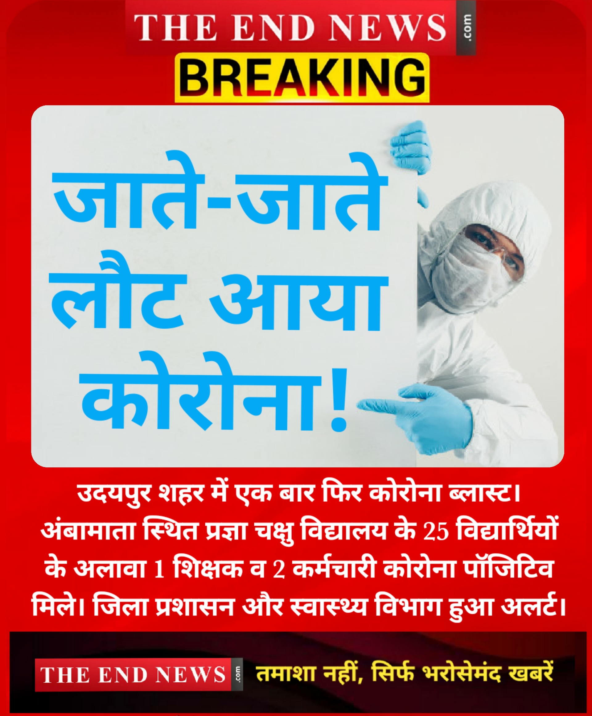 उदयपुर। कोरोना एक बार जाते जाते फिर लौट आया है। राजस्थान में कोरोना का कहर फिर से बढ़ता हुआ नजर आ रहा है। इसी कड़ी में उदयपुर के स्कूल में एक साथ करीब 28 कोरोना पॉजिटिव केस मिले। इनमें 25 छात्र और स्कूल स्टाफ के सदस्य शामिल हैं। उदयपुर में एक फिर कोरोना ब्लास्ट होने से चिंताएं बढ़ गई हैं। एक साथ एक ही क्षेत्र से 28 कोरोना पॉजिटिव मिलने पर जिला प्रशासन और चिकित्सा विभाग पूरी तरह से अलर्ट हो गया है।