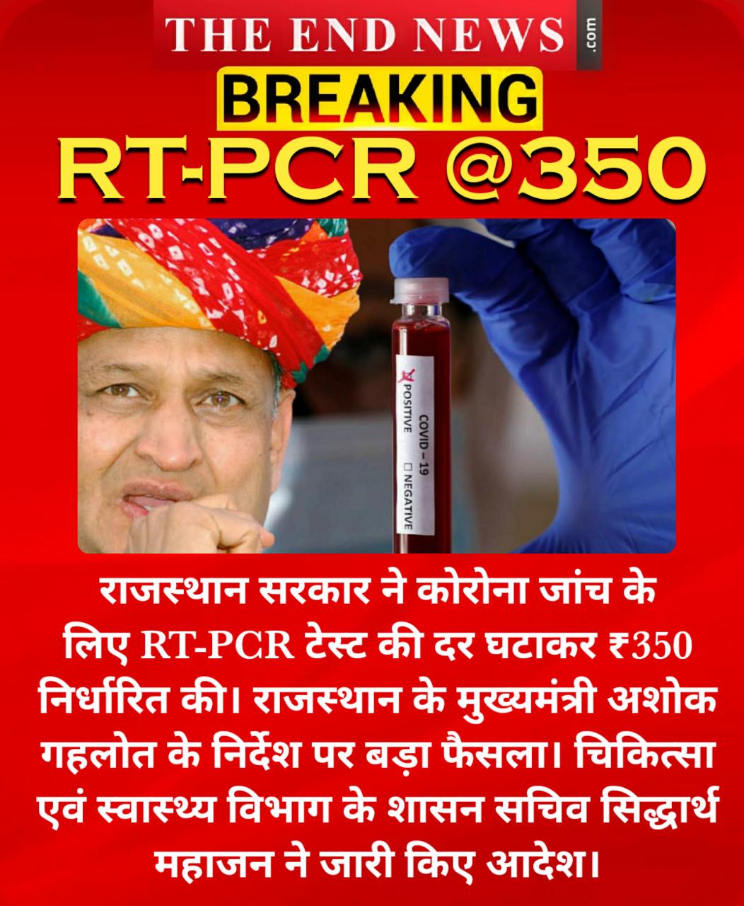 जयपुर। राजस्थान में बढ़ते कोरोना संक्रमण के बीच में राजस्थान सरकार ने एक और बड़ी राहत आमजन को दी है। अब कोरोना RT-PCR टेस्ट के लिए ₹500 नहीं बल्कि ₹350 फीस देनी होगी। सरकार ने अब कोरोना टेस्ट की दर ₹350 निर्धारित कर दी है। राजस्थान के मुख्यमंत्री अशोक गहलोत के निर्देश पर आदेश जारी किए गए। राजस्थान सरकार के चिकित्सा एवं स्वास्थ्य विभाग के शासन सचिव सिद्धार्थ महाजन ने यह आदेश जारी किया।