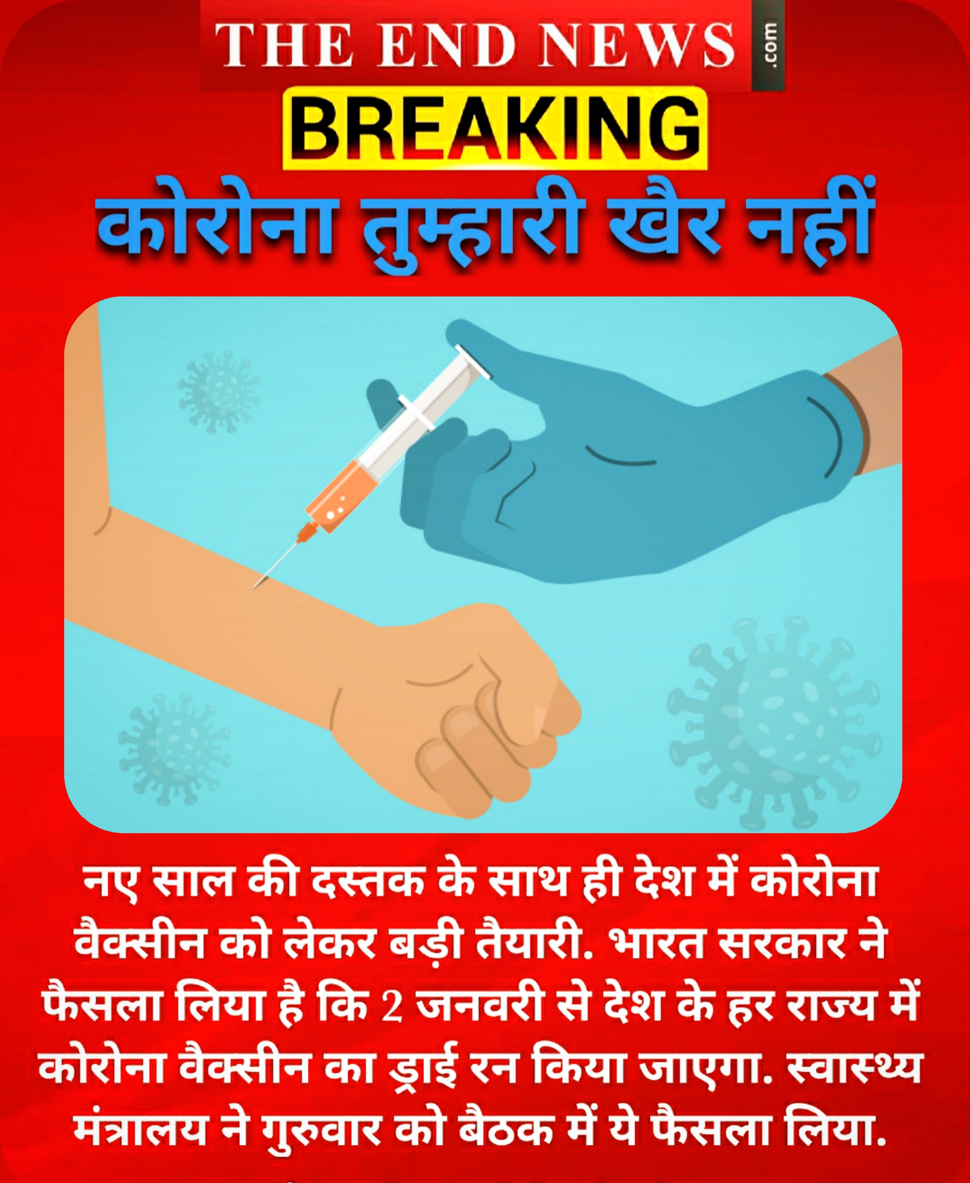 नई दिल्ली. कोरोना के खात्मे का काउंटडाउन शुरू हो चुका है. दुनियाभर में कई देशों के साथ भारत ने भी कोरोना को भगाने के लिए पूरी तरह से कमर कस ली है. इसी कड़ी में भारत सरकार ने एक बड़ा फैसला करते हुए 2 जनवरी से पूरे देश भर में कोरोना वैक्सीन के ड्राई रन (dry-run) को शुरू करने का फैसला किया है. स्वास्थ्य मंत्रालय की गुरुवार को हुई बैठक में यह फैसला किया गया.
