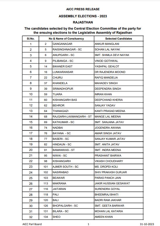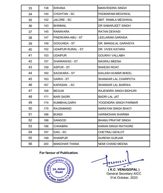 Fourth list of Rajasthan Congress released: राजस्थान कांग्रेस की चौथी लिस्ट जारी कर दी गई है। लम्बे इंतजार और लंबे मंथन के बाद इन सीटों पर 56 उम्मीदवारों के नामों की घोषणा की गई हैं। राजस्थान कांग्रेस की चौथी लिस्ट का काउंटडाउन पिछले तीन दिनों से चल रहा था लेकिन आज यह काउंटडाउन समाप्त हुआ। रविवार और सोमवार को हुई स्क्रीनिंग कमेटी की बैठक में इन नामों पर मुहर लगी। गहलोत और पायलट दोनों ने ही अपने अपने उम्मीदवारों को लिस्ट में शामिल करवाने के लिए पूरा जोर लगाया।