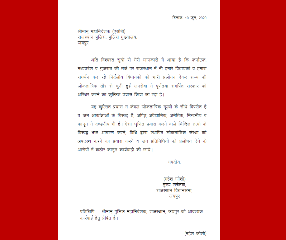 मध्य प्रदेश, गुजरात, कर्नाटक की तर्ज पर राजस्थान में भी सरकार गिराने के प्रयास किए जाने की सूचना सामने आई है. राजस्थान सरकार के मंत्रियों और मुख्यमंत्री तक पहुंची इसकी सूचना के तुरंत बाद विधायक और मुख्य सचेतक महेश जोशी ने राजस्थान के एसीबी पुलिस महानिदेशक को पत्र लिखकर सरकार को अस्थिर करने में लगी ताकतों के खिलाफ तुरंत कार्रवाई करने की मांग की है. साथ ही आरोप लगाया है कि कई विधायकों को लगातार फोन करके उनकी खरीद-फरोख्त का प्रयास किया जा रहा है. सरकार ने इस संबंध में एक लिखित शिकायत भी डीजीपी को की है.