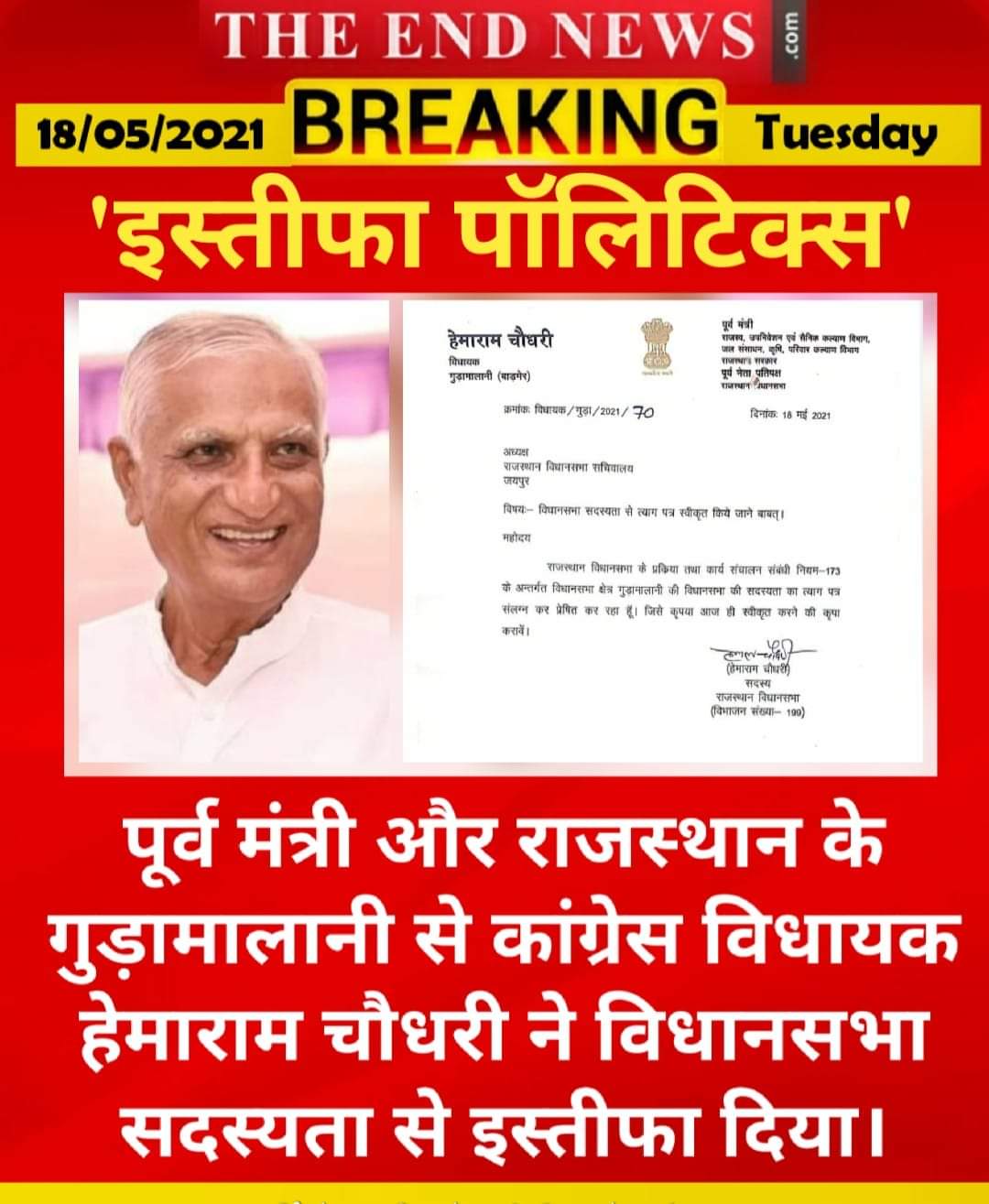 हेमाराम चौधरी लगातार मुख्यमंत्री अशोक गहलोत सरकार से भी नाराज चल रहे थे। सरकार को अस्थिर करते वक्त पिछले साल वो पायलट गुट के साथ लगातार विरोध में खड़े हुए थे। हेमाराम चौधरी ने विधानसभा अध्यक्ष को अपना इस्तीफा भेज दिया है।