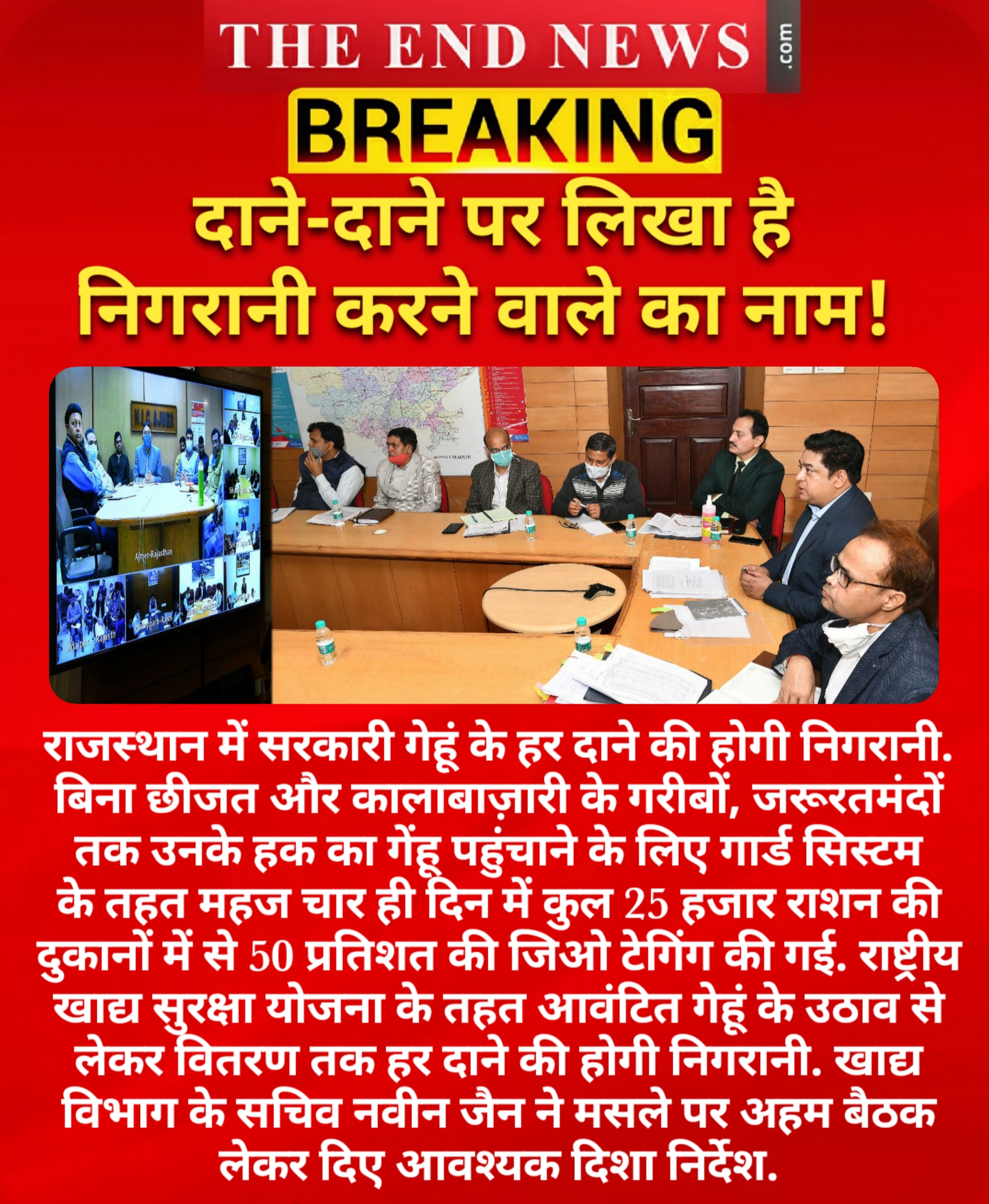 शासन सचिव नवीन जैन ने प्रधानमन्त्री गरीब कल्याण अन्न योजना के तहत आवंटित चना समय पर राशन डीलरों की दुकानों तक नहीं पहुंचाने पर जांच के लिए टीम का गठन किया है. ताकि लापरवाह कार्मिकों पर एक्शन लिया जा सके. इसके अलावा उन्होंने कोविड.19 के समय कराये गये विशेष सर्वे के दौरान चिन्ह्ति जरूरतमंद एवं बेसहारा परिवारों को गेहूं एवं चने का वितरण शीघ्र करवाने के भी निर्देश दिये. इतना ही नहीं जोधपुर, अलवर, डूंगरपुर एवं बांरा जिलों की प्रगति संतोषजनक नहीं पाये जाने पर गहरी नाराजगी व्यक्त की.