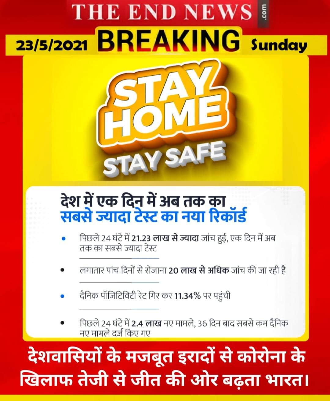 3,55,102 नए डिस्चार्ज के बाद कुल डिस्चार्ज की संख्या 2,34,25,467 हो गई। देश में सक्रिय मामलों की कुल संख्या 28,05,399 है। भारत में कल कोरोना वायरस के लिए 21,23,782 सैंपल टेस्ट किए गए, कल तक कुल 32,86,07,937 सैंपल टेस्ट किए जा चुके हैं।