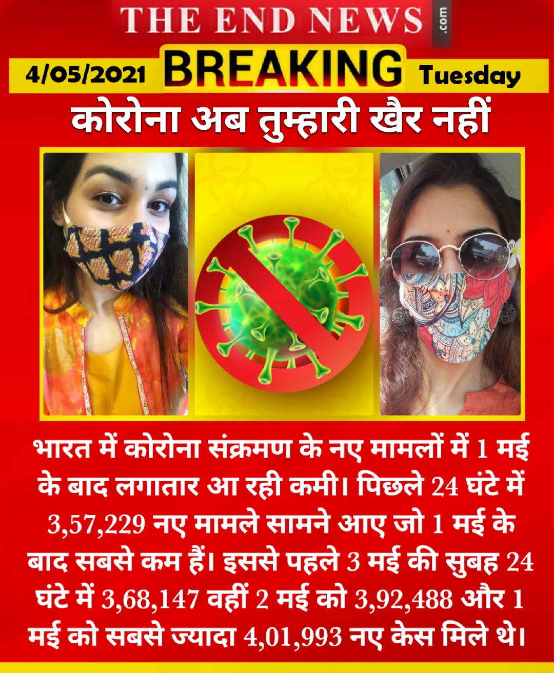 शनिवार को यानी 1 मई को भारत में कोरोना ने सारे रिकॉर्ड तोड़ दिए थे और यहां 24 घण्टों में अब तक में सबसे ज्यादा 4,01,993 नए केस मिले थे। ऐसे में 1 मई से लगातार कम होती रफ्तार ने थोड़ी राहत जरूर दी है। 1 मई की तुलना में करीब 44 हजार केस प्रतिदिन कम हो गए हैं।