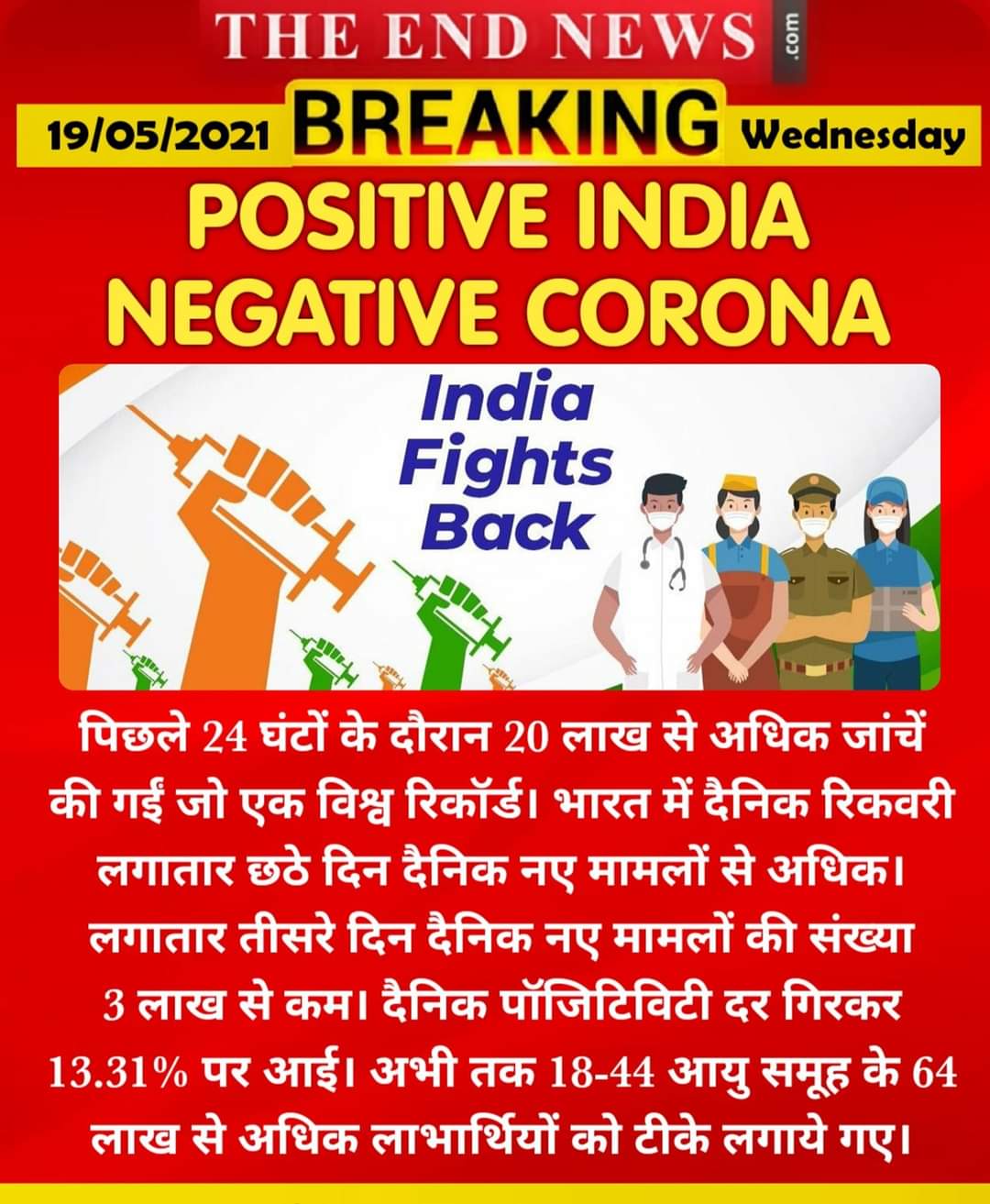 राष्ट्रीय रिकवरी दर और अधिक बढ़कर 86.23 प्रतिशत तक पहुंच गई है। नई रिकवरी के 74.94 प्रतिशत में दस राज्यों की भागीदारी है। दिल्ली। पिछले 24 घंटों के दौरान 20 लाख से अधिक जांचें की गईं ( भारत में एक दिन में की गई अब तक की सर्वाधिक जांच), जबकि दैनिक पोजिटिविटी दर गिरकर 13.31 प्रतिशत पर आ गई है। पिछले 24 घंटों के दौरान देश में 20.08 लाख जांचें की गईं जो एक विश्व रिकॉर्ड भी है। अभी तक देश में 32 करोड़ से अधिक जांचें की जा चुकी हैं।