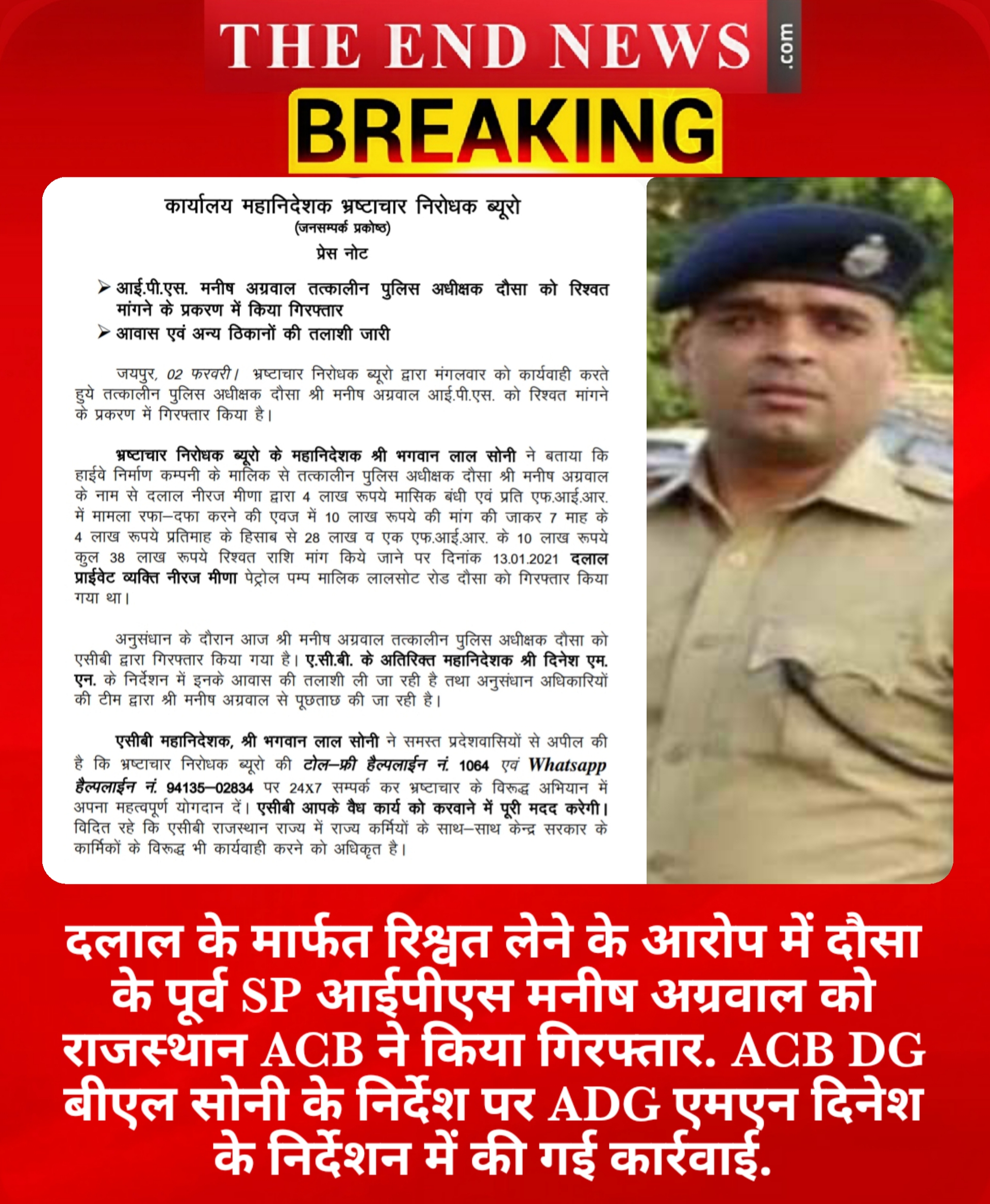 जयपुर. खाकी को बदनाम करने वाला भ्रष्टाचारी आईपीएल राजस्थान एंटी करप्शन ब्यूरो ने रेस्ट कर लिया है. दौसा में एसपी रहे आईपीएस मनीष अग्रवाल पर दौसा एसपी रहते हुए हाइवे बना रही कंपनी को धमकाकर 38 लाख रुपए की रिश्वत लेने का आरोप है. मनीष अग्रवाल को दोपहर करीब 1 बजे जयपुर के झालाना स्थित एसीबी ऑफिस लाया गया. एसीबी महानिदेशक बीएल सोनी ने बताया कि आईपीएस मनीष के घर की तलाशी की जा रही है. हाइवे निर्माण कंपनी से रिश्वत लेने के मामले में एसीबी की यह चौथी गिरफ्तारी है. इस मामले में एसीबी ने 13 जनवरी को बांदीकुई की एसडीएम रही पिंकी मीणा और दौसा एसडीएम रहे पुष्कर मित्तल और दलाल नीरज मीणा को गिरफ्तार किया था. यह तीनों अभी जेल में हैं.