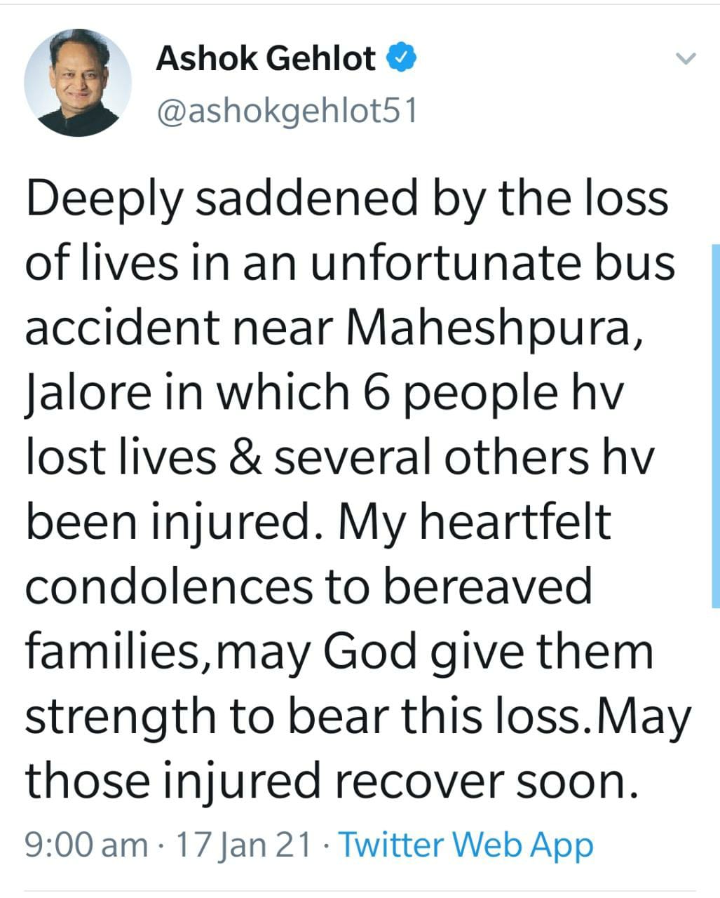 जालोर. जिले से 7 किमी दूर महेशपुरा गांव में देर रात एक बस 11 हजार वोल्ट की हाइटेंशन लाइन की चपेट में आ गई और बस में आग लग गई. इससे 6 लोग जिंदा जल गए. 36 लोग झुलस गए. इनमें से ज्यादातर जालोर जिला अस्पताल में भर्ती हैं. कुछ लोगों की हालत गंभीर होने के चलते उन्हें जोधपुर रैफर कर दिया गया. सभी लोग जैन समाज के हैं, जो नाकोड़ा तीर्थ से दर्शन करने के बाद अजमेर और ब्यावर लौट रहे थे. हादसे में ब्यावर की सोनल, सुरभि, चांद देवी, अजमेर के राजेन्द्र और ड्राइवर धर्मचंद जैन की मौत हो गई. कंडक्टर की भी मौत हो गई. जो लोग झुलसे हैं उनमें से कुछ की पहचान हो पाई है. उधर CM गहलोत ने सभी आला अधिकारियों को मौके पर पहुंचकर हर संभव मदद देने के निर्देश दिए.