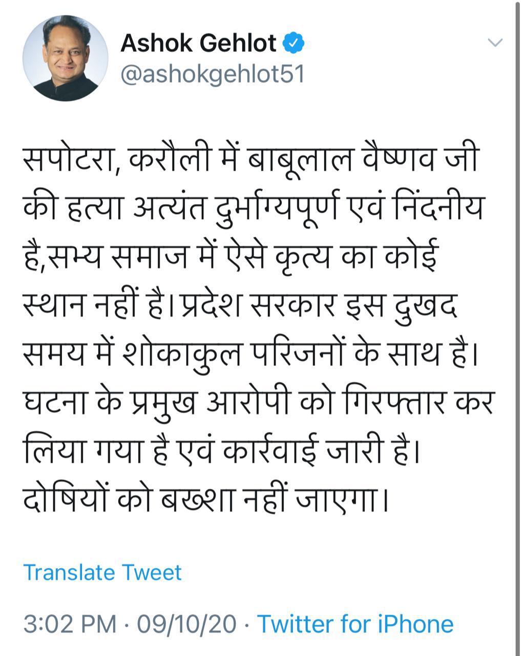 मुख्यमंत्री अशोक गहलोत ने घटना को दुर्भाग्यपूर्ण और निंदनीय बताते हुए कहा कि सभ्य समाज में ऐसे कृत्य का कोई स्थान नहीं है. प्रदेश सरकार खुद इस दुखद घटना के समय शोकाकुल परिजनों के साथ है. घटना का मुख्य आरोपी गिरफ्तार कर दोषियों के खिलाफ कार्रवाई की जा रही है. दोषियों को बख्शा नहीं जाएगा.