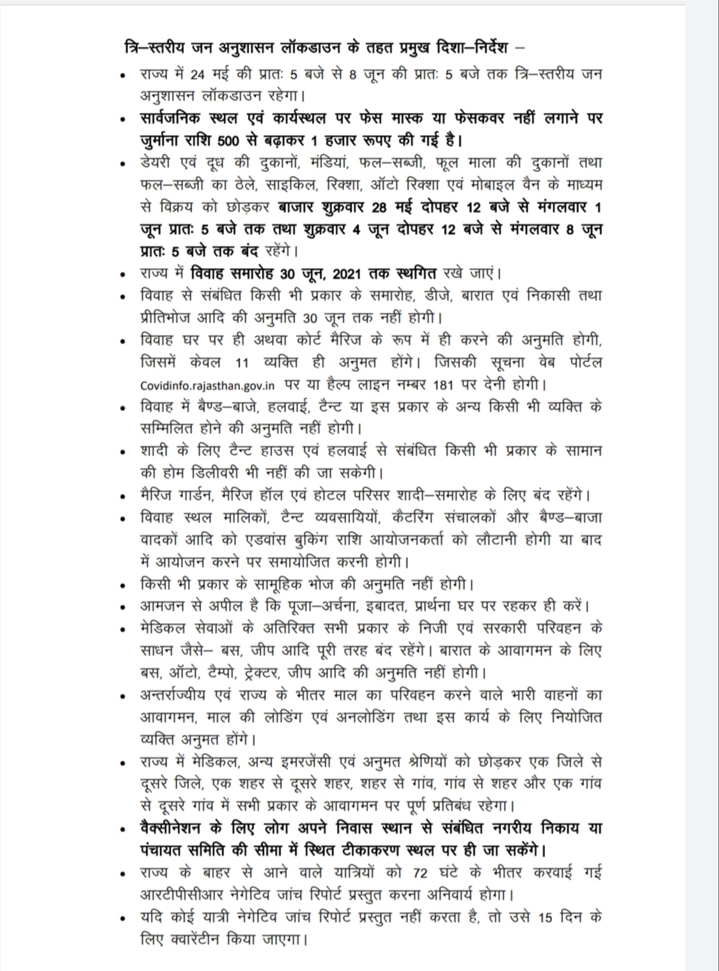 जयपुर। राजस्थान में लॉकडाउन को 8 जून तक बढ़ा दिया गया है। अब मास्क नहीं लगाने पर 500 के बजाय ₹1000 का जुर्माना लगाया जाएगा। त्रिस्तरीय जन अनुशासन लॉकडाउन इसको नाम दिया गया है।