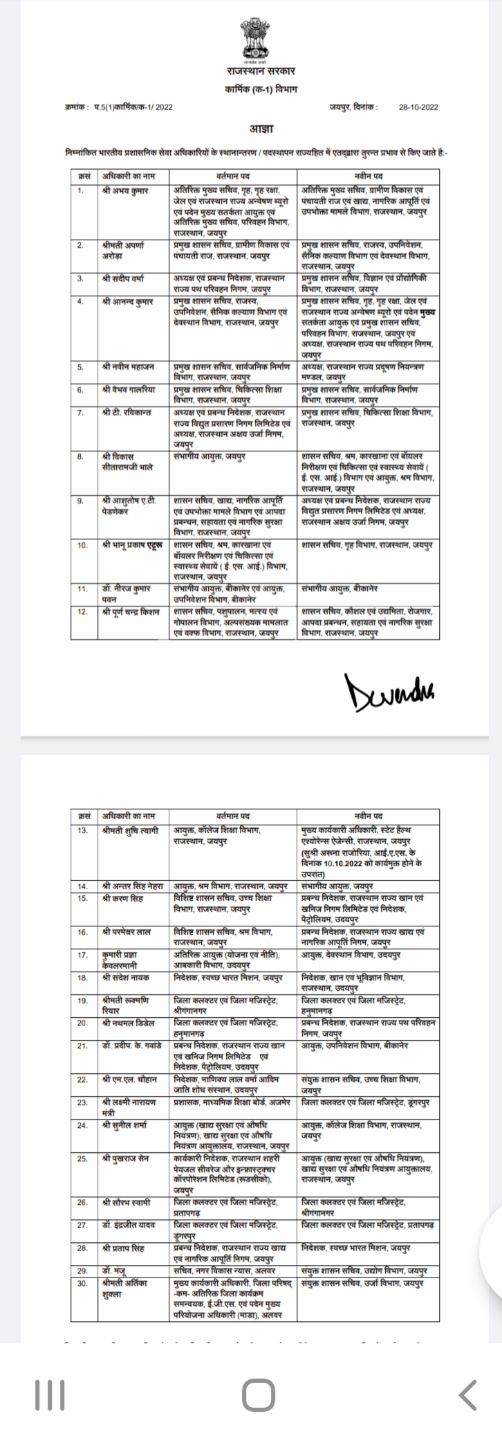 राजस्थान सरकार चुनावों से पहले एक्शन मोड में नजर आने लगी है। राजस्थान के नए डीजीपी की घोषणा के बाद अब 30 आईएएस अफसरों के तबादले कर दिए गए हैं। 6 प्रशासनिक अधिकारियों को अतिरिक्त चार्ज भी दिया गया है। आनंद कुमार को गृह विभाग की जिम्मेदारी दी गई है। अतिरिक्त मुख्य सचिव के तौर पर अभय कुमार को ग्रामीण विकास एवं पंचायती राज विभाग के साथ खाद्य, नागरिक आपूर्ति एवं उपभोक्ता मामलात विभाग का जिम्मा सौंपा गया है। अपर्णा अरोड़ा को ग्रामीण विकास विभाग से हटाकर राजस्व, उपनिवेशन, सैनिक कल्याण विभाग एवं देवस्थान विभाग का जिम्मा सौंपा गया है। राजस्थान में कार्मिक विभाग की ओर से जारी आईएएस तबादला लिस्ट में नवीन महाजन को PWD विभाग के प्रमुख शासन सचिव के पद से हटाकर अध्यक्ष, राजस्थान प्रदूषण नियंत्रण मंडल लगाया गया है। जबकि स्वास्थ्य विभाग के प्रमुख शासन सचिव वैभव गालरिया को PWD विभाग का प्रमुख शासन सचिव लगाया है। टी. रविकांत को प्रमुख शासन सचिव के तौर पर चिकित्सा शिक्षा विभाग का जिम्मा सौंपा गया है। इससे पहले टी. रविकांत राजस्थान राज्य विद्युत प्रसारण निगम लिमिटेड के अध्यक्ष एवं प्रबंध निदेशक के साथ राजस्थान अक्षय उर्जा निगम के अध्यक्ष पद का जिम्मा संभाल रहे थे। विकास सीताराम भाले को शासन सचिव श्रम एवं कारखाना एवं बायलर लगाया गया है। आशुतोष ए.टी. पेडणेकर को अध्यक्ष एवं प्रबंध निदेशक राजस्थान विद्युत प्रसारण निगम लिमिटेड लगाया गया है। भानु प्रकाश अटरू को शासन सचिव गृह विभाग, नीरज के. पवन से उपनिवेशन विभाग आयुक्त का चार्ज वापस लिया गया है, अब उनको संभागीय आयुक्त बीकानेर के पद पर रखा गया है। पीसी किशन को शासन सचिव कौशल एवं उद्यमिता विभाग, शुचि त्यागी को मुख्य कार्यकारी अधिकारी स्टेट हेल्थ इंश्योरेंस लगाया गया है। अंतर सिंह नेहरा को संभागीय आयुक्त जयपुर लगाया गया है। आईएएस करण सिंह को प्रबंध निदेशक राज्य खान एवं खनिज विभाग लिमिटेड़, परमेश्वर लाल को प्रबंध निदेशक राज्य खाद्य एवं नागरिक आपूर्ति विभाग, कुमारी प्रज्ञा केवलरमानी आय़ुक्त देवस्थान विभाग, संदेश नायक निदेशक खान एवं भूवैज्ञानिक विभाग में लगाया गया है। नथमल डिडेल को प्रबंध निदेशक राज्य पथ परिवहन निगम जयपुर लगाया गया है। प्रदीप गवांडे को आयुक्त, उपनिवेशन विभाग बीकानेर लगाया गया है। हालांकि प्रशासनिक महकमें में कुछ अच्छे, निर्विवाद और रिजल्ट ऑरिएंटेड ऑफिसर्स के बार-बार तबादला करने को लेकर भी चर्चाएं जोरों पर रही, जहां सरकार के आए हुए चार साल में ही एक सीनियर आईएएस का 8 बार तबादला कर दिया गया, इस लिस्ट में भी उस आईएएस का नाम डाला गया है।