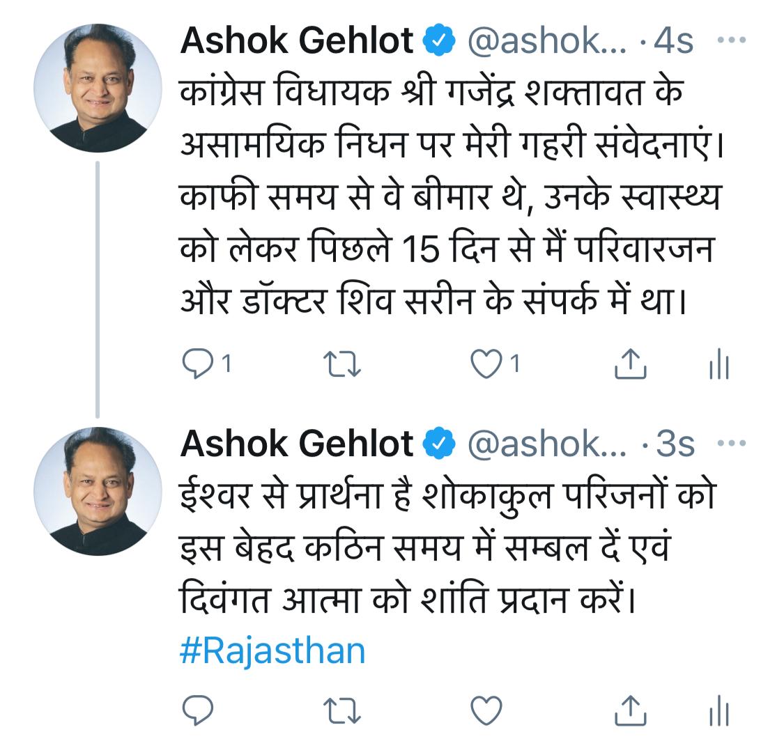 सीएम गहलोत ने कहा कि वे उनके स्वास्थ्य को लेकर वे पिछले 15 दिन से परिवारजन और डॉक्टर शिव सरीन के संपर्क में थे. विधायक शक्तावत के निधन की सूचना के बाद आज होने वाली कैबिनेट की बैठक स्थगित कर दी गई. वहीं प्रस्तावित दिशा समिति की बैठक को भी स्थगित कर दिया गया है.