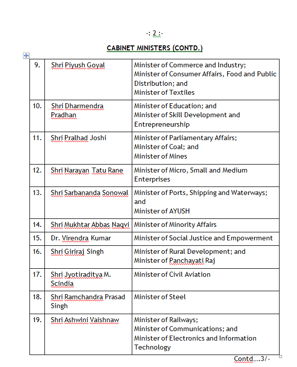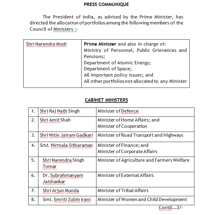 प्रधानमंत्री नरेंद्र मोदी विज्ञान और प्रौद्योगिकी मंत्रालय की निगरानी करेंगे। अमित शाह गृह मंत्रालय के अलावा सहकारिता मंत्रालय की निगरानी करेंगे। अश्विनी वैष्णव रेल मंत्री के साथ आईटी और संचार मंत्री होंगे।