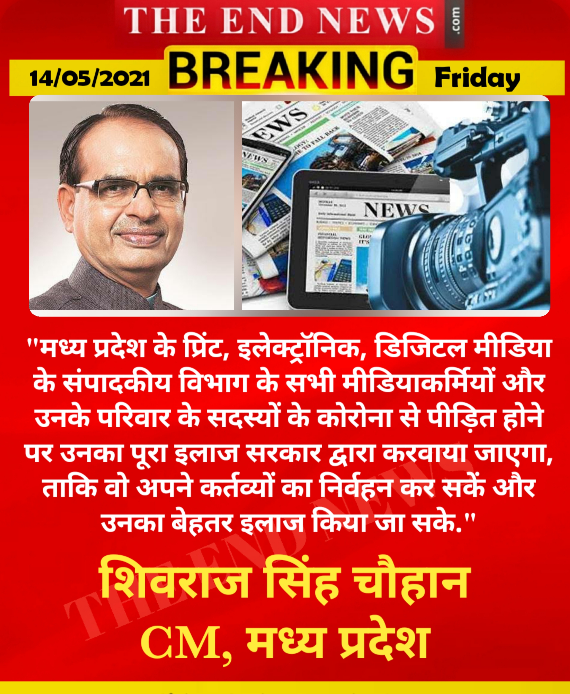 CM ने कहा कि प्रिंट, इलेक्ट्रॉनिक, डिजिटल मीडिया के सभी मीडियाकर्मी जो अधिमान्य हों या गैर अधिमान्य हों, उनका और उनके परिवार का कोई भी सदस्य कोरोना बीमारी से पीड़ित होगा तो मध्य प्रदेश सरकार उनको उनके हाल पर नहीं छोड़ेगी। उनका इलाज करवाया जाएगा।