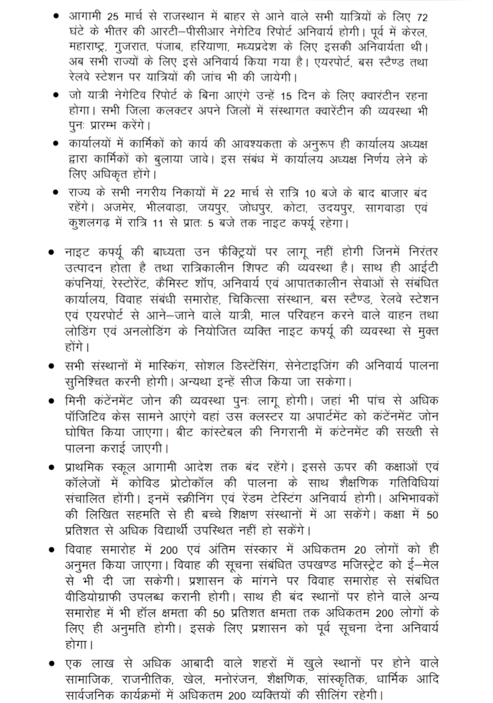 जयपुर. कोरोना के बढ़ते खतरे के बीच राजस्थान सरकार एक बार फिर से एक्टिव मोड पर है. राजस्थान सरकार ने राजस्थान की राजधानी जयपुर सहित 8 शहरों में रात 11:00 बजे से सुबह 5:00 बजे तक नाइट कर की घोषणा कर दी है. 22 मार्च की रात से यह आदेश लागू हो जाएगा. अजमेर, भीलवाड़ा, जयपुर, जोधपुर, कोटा, उदयपुर, सागवाड़ा, कुशलगढ़ में रात 11:00 बजे से लेकर सुबह 5:00 बजे तक नाइट कर्फ्यू लागू रहेगा. इसके अलावा 22 मार्च से रात 10 बजे बाद राज्य के किसी भी नगरीय निकाय में बाजार नहीं खुलेंगे. हालांकि आवश्यक सेवाओं पर यह नियम लागू नहीं होगा.