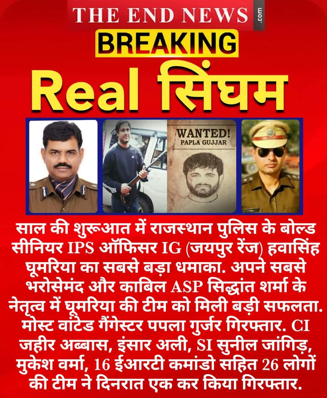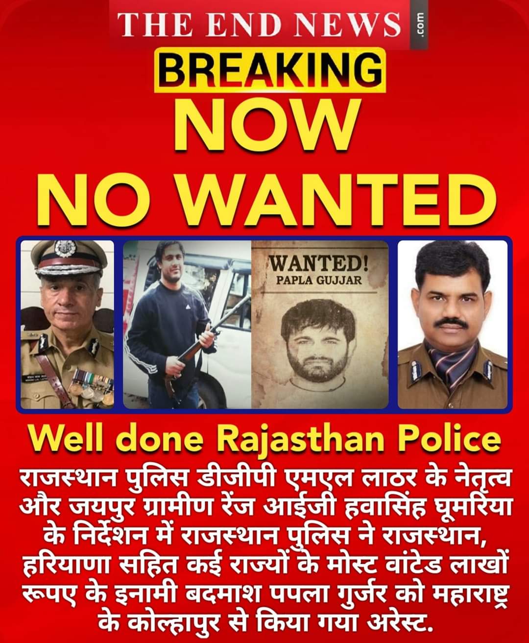 जयपुर रेंज आईजी हवासिंह घुमरिया के नेतृत्व में विशेष टीम ने इस पूरी कार्रवाई को अंजाम दिया. पुलिस की विशेष टीम ने कुख्यात वांछित अपराधी विक्रम गुर्जर उर्फ पपला एवं इसकी महिला मित्र जियाउससहर सिगलीगर निवासी सतारा को 28 जनवरी प्रातः महाराष्ट्र के कोल्हापुर से धर दबोचा.