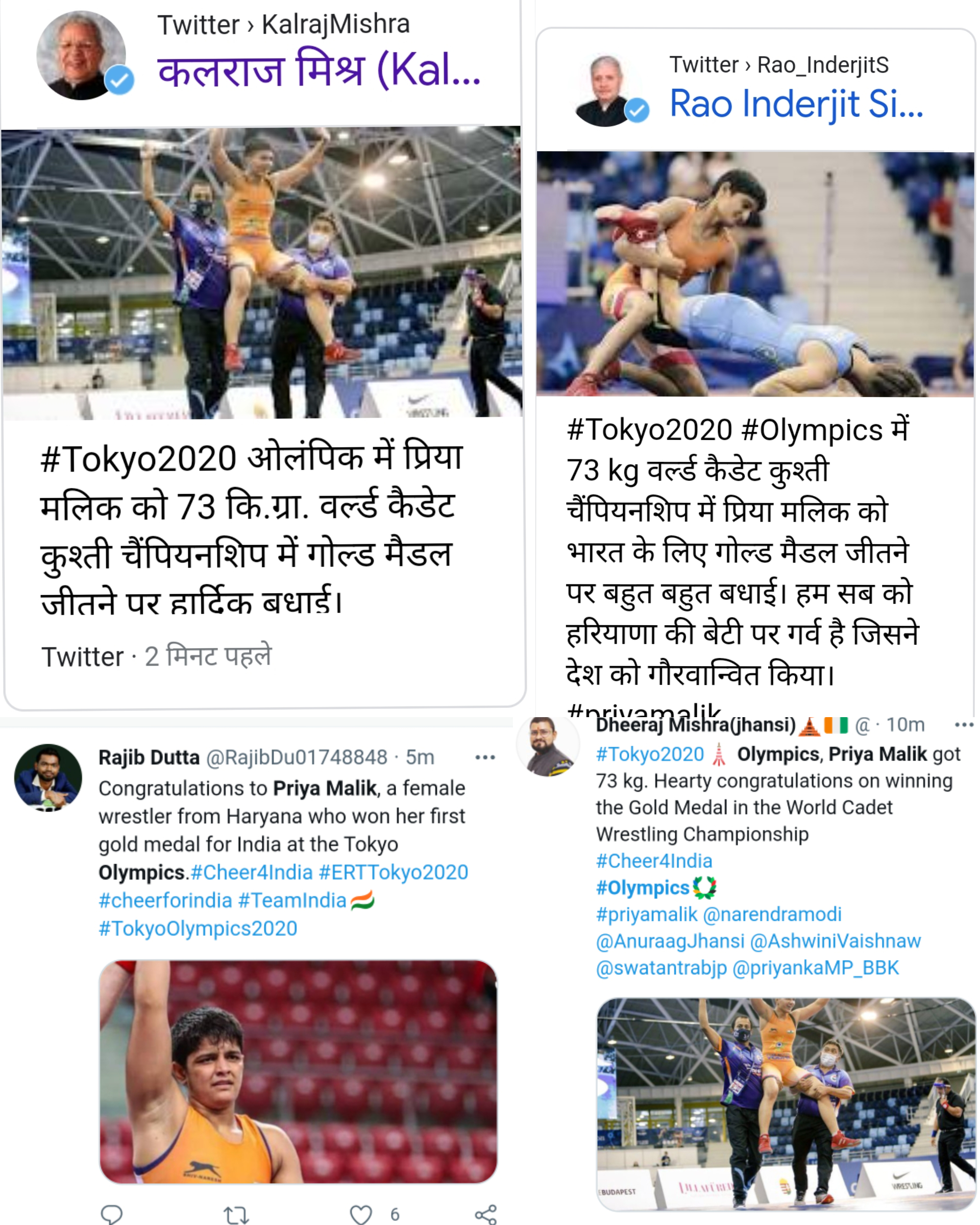 हरियाणा। चौधरी भरत सिंह मेमोरियल खेल स्कूल निडानी की खिलाड़ी प्रिया ने हंगरी के बूडापेस्ट में चल रही विश्व कैडेट कुश्ती चैंपियनशिप में गोल्ड मेडल पर जीत लिया है। 73 किलो भार वर्ग की होनहार खिलाड़ी प्रिया देश की उभरती युवा पहलवान है। उनकी जीत पर बधाइयों का दौर भी तेज हो गया है। प्रिया के कोच ने कहा कि अंशु मलिक के बाद अगले ओलिपिक में प्रिया भी देश का प्रतिनिधित्व करेगी। संस्था के संरक्षक प्रदेश के पूर्व डीजीपी डा. महेंद्र सिंह मलिक ने प्रिया को बधाई दी। उधर प्रिया को कई बड़ी हस्तियों ने बधाई दी लेकिन एक गफलत भी देखने को मिली जहां उन्हें पहले टोक्यो ओलंपिक में जीत की बधाई मिलने लगी, सोशल मीडिया और व्हाट्स एप ग्रुप्स में प्रिया ट्रेंड भी करने लगी। बाद में इस गफलत को सुधारा गया।