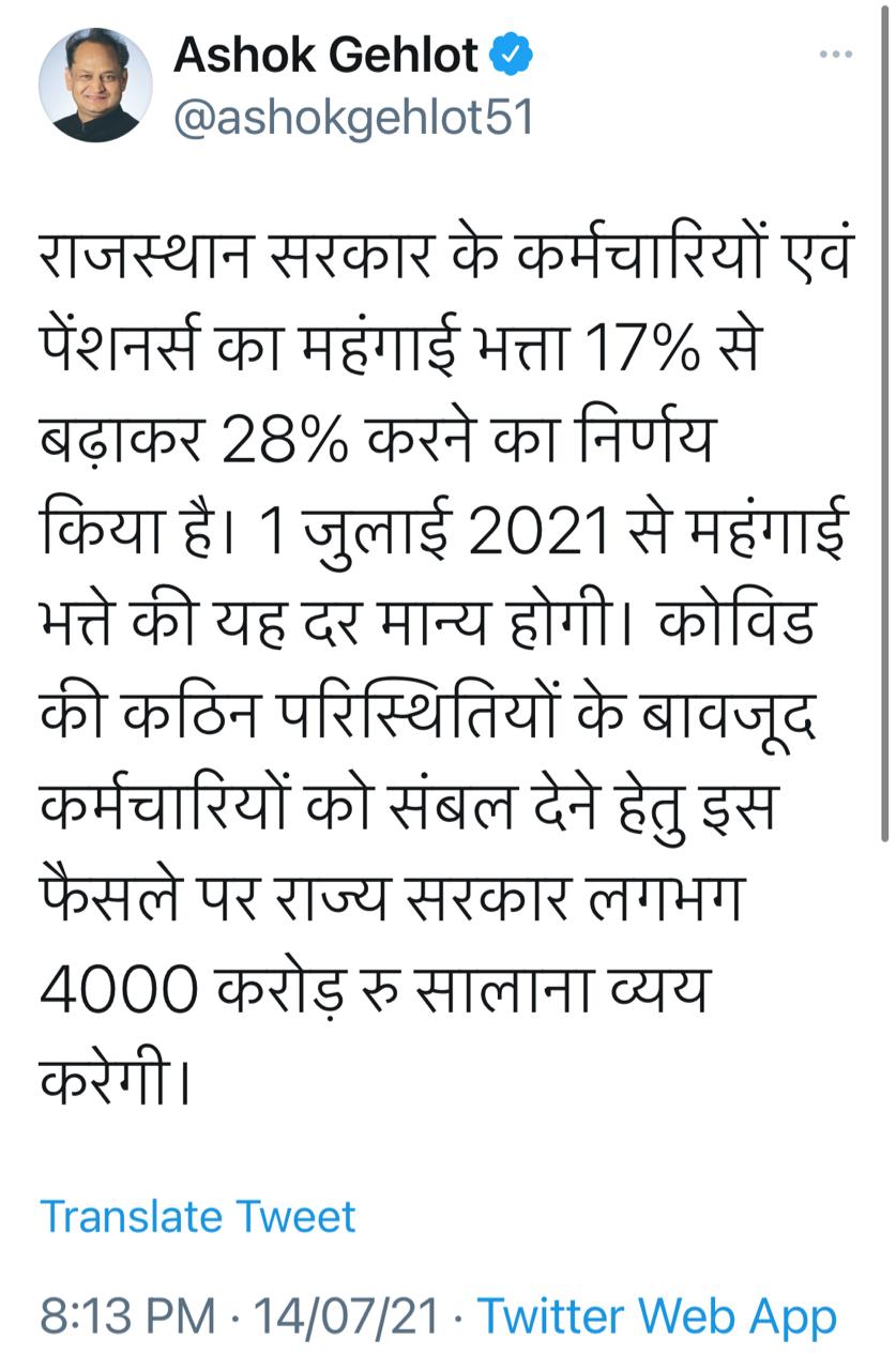 राजस्थान सरकार के कर्मचारियों एवं पेंशनर्स के लिए 1 जुलाई 2021 से महंगाई भत्ते की यह बढ़ी दर मान्य होगी। कोविड संकट के वक़्त इस फैसले पर राज्य सरकार लगभग 4000 करोड़ रु सालाना व्यय करेगी।