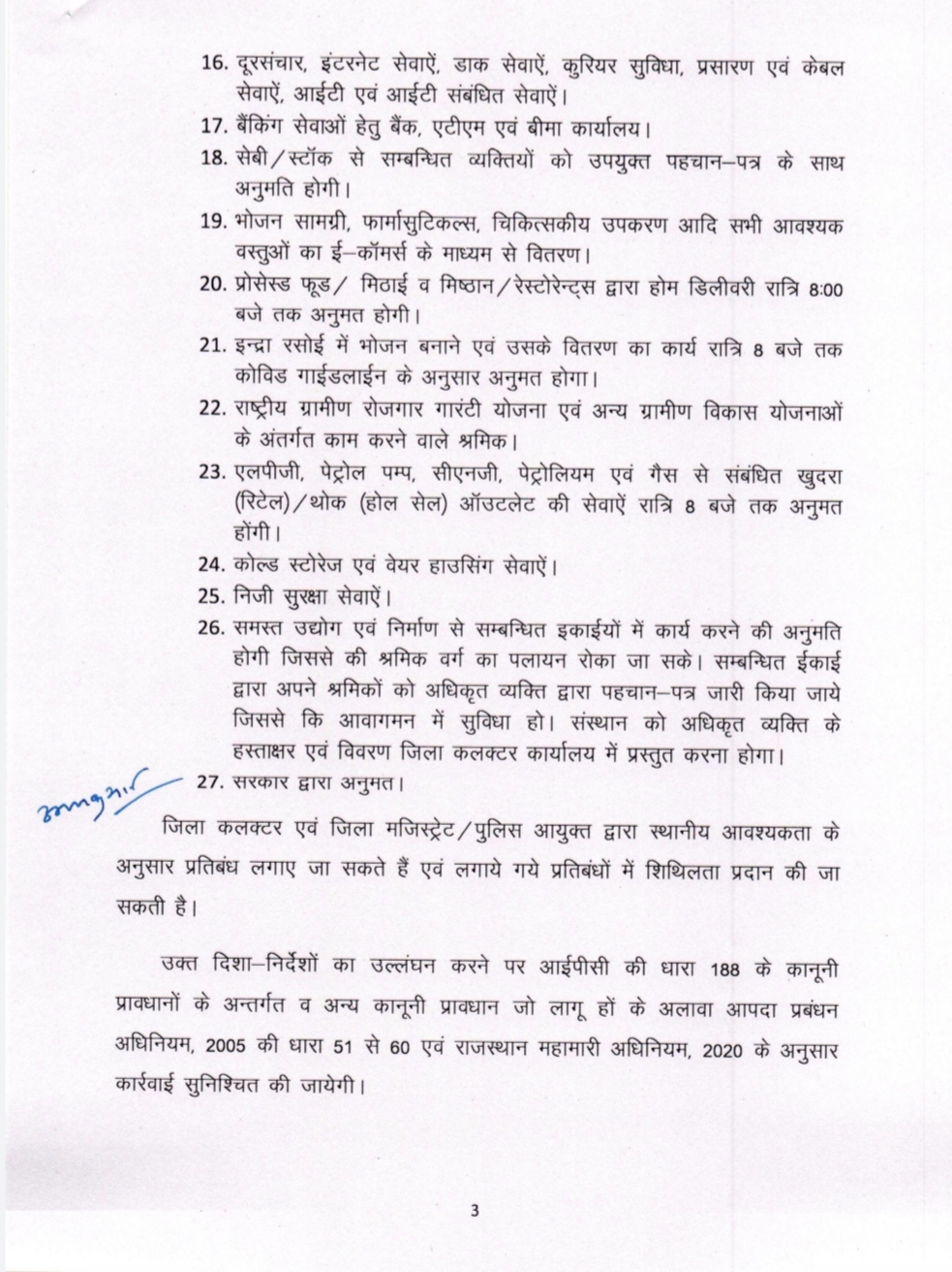 जयपुर। राजस्थान में 3 मई तक 'जन अनुशासन पखवाड़ा' का सख्त कर्फ्यू रहेगा। जिसके तहत जरूरी सेवाओं में छूट दी गई है। सरकार के आदेशों के मुताबिक 19 अप्रैल को सुबह 5:00 बजे से लेकर 3 मई को सुबह 5:00 बजे तक जन अनुशासन पखवाड़ा मनाया जाएगा। जिसमें सभी कार्यालय, व्यवसायिक प्रतिष्ठान और बाजार बंद रहेंगे। सामान्य गतिविधियां जिनके कारण कोरोना संक्रमण अधिक बढ़ रहा है वह प्रतिबंधित रहेंगे। जन अनुशासन पखवाड़े के दौरान लागू होने वाले प्रतिबंध जन सामान्य की सुविधा एवं आवश्यक सेवाओं एवं वस्तुओं की निरंतर उपलब्धता का ध्यान में रखते हुए महत्वपूर्ण सेवाओं पर लागू नहीं होंगे।