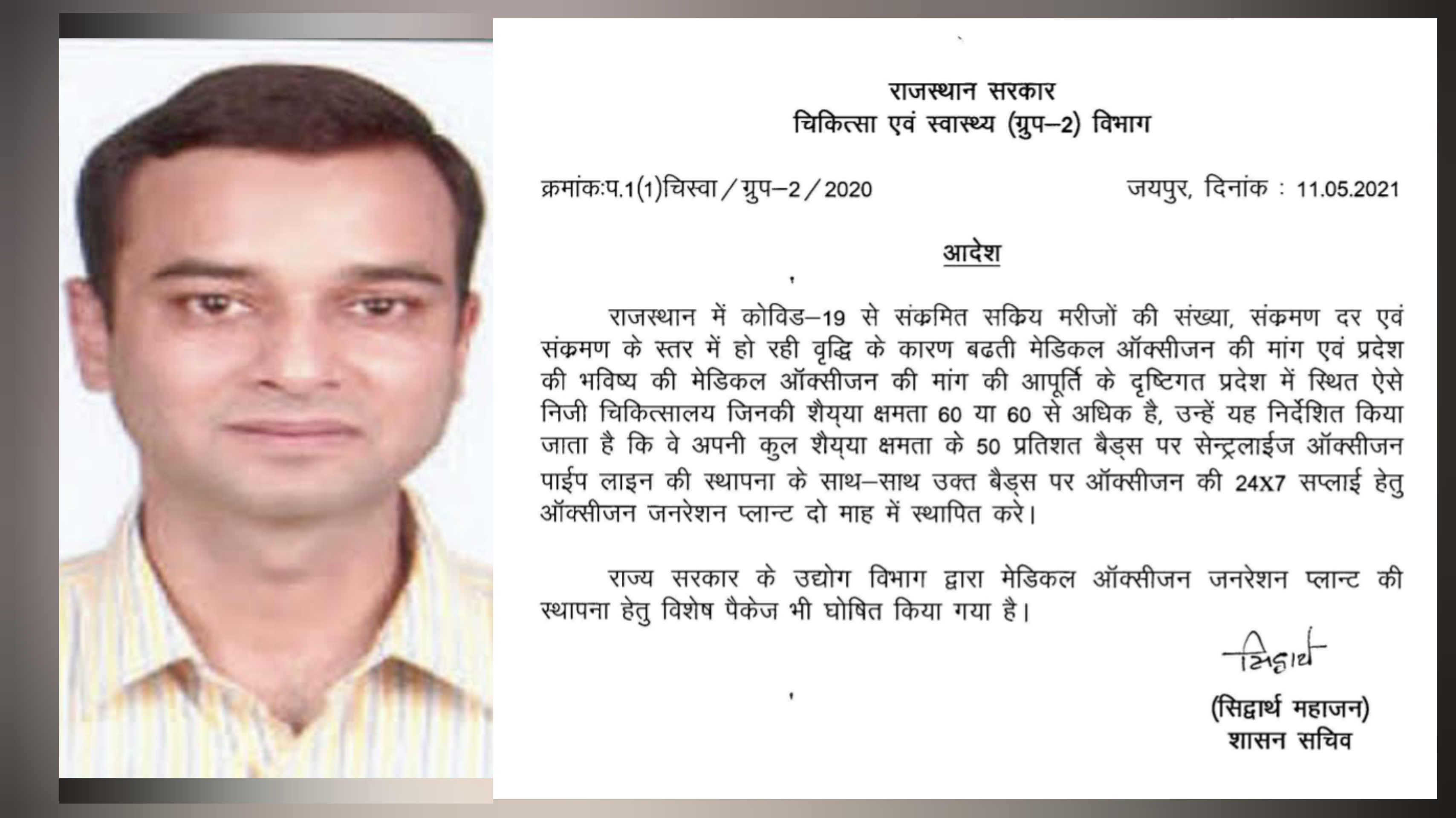 जयपुर। राजस्थान में कोरोना संकटकाल में लगातार सामने आ रही ऑक्सीजन की कमी और समस्या के स्थाई समाधान के लिए राजस्थान सरकार ने कठोर कदम उठाए हैं। अब बड़े निजी चिकित्सालय में खुद का ऑक्सीजन प्लांट होना अनिवार्य होगा। और इसकी स्थापना अगले 2 माह के अंदर करनी होगी। राजस्थान सरकार के चिकित्सा एवं स्वास्थ्य विभाग के शासन सचिव सिद्धार्थ महाजन की ओर से जारी आदेश के मुताबिक राजस्थान में अब निजी चिकित्सालय जिनकी बेड क्षमता 60 या 60 से अधिक की है उन्हें कुल बेड के 50% बेड पर सेंट्रलाइज ऑक्सीजन पाइप लाइन की स्थापना करनी होगी।