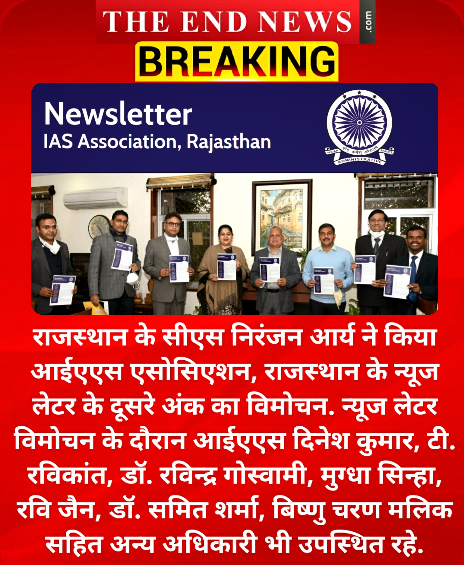 जयपुर. राजस्थान के मुख्य सचिव निरंजन आर्य ने शासन सचिवालय में आईएएस एसोसिएशन (राजस्थान) के न्यूज लेटर के दूसरे अंक का विमोचन किया. इस मौके पर आर्य ने एसोसिएशन की ओर से आयोजित सालभर आयोजित हुई गतिविधियों पर चर्चा की वहीं आगामी वर्ष की प्राथमिकताओं पर भी जानकारी ली. एसोसिएशन के सदस्यों ने इस दौरान नए वर्ष में होने वाले कार्यक्रमों की जानकारी दी वहीं आईएएस काडर के समक्ष आने वाली आवासीय समस्याओं सहित विभिन्न मुद्दों पर चर्चा की.