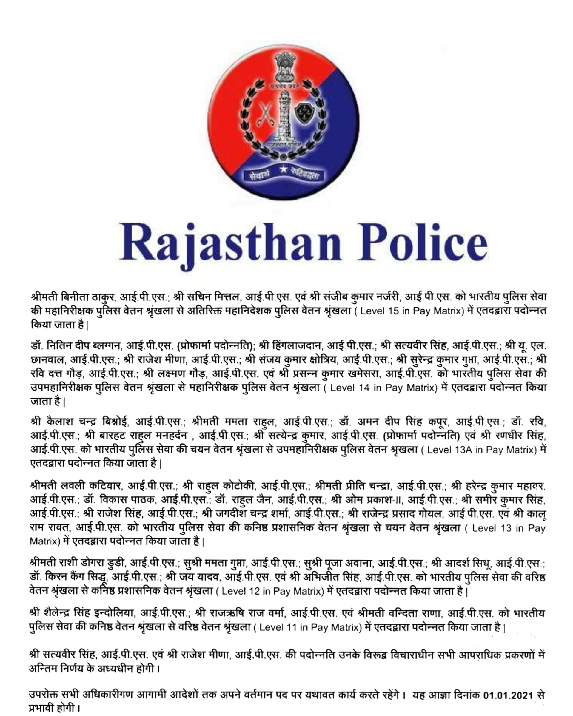 1996 बैच के राजस्थान कैडर के तीन आईपीएस विनीता ठाकुर,सचिन मित्तल, संजीव नार्जरी एडीजी के पद पर पदोन्नत हुए. IPS डॉ. नितिनदीप, हिंगलाजदान, सत्यवीर सिंह, यूएल छानवाल, राजेश मीणा, संजय कुमार श्रोत्रिय, सुरेंद्र कुमार गुप्ता, रविदत्त गौड़, लक्ष्मण गौड़, प्रसन्न कुमार खमेसरा को डीआईजी से पुलिस महानिरीक्षक (IG) के पद पर पदोन्नति हुए.
