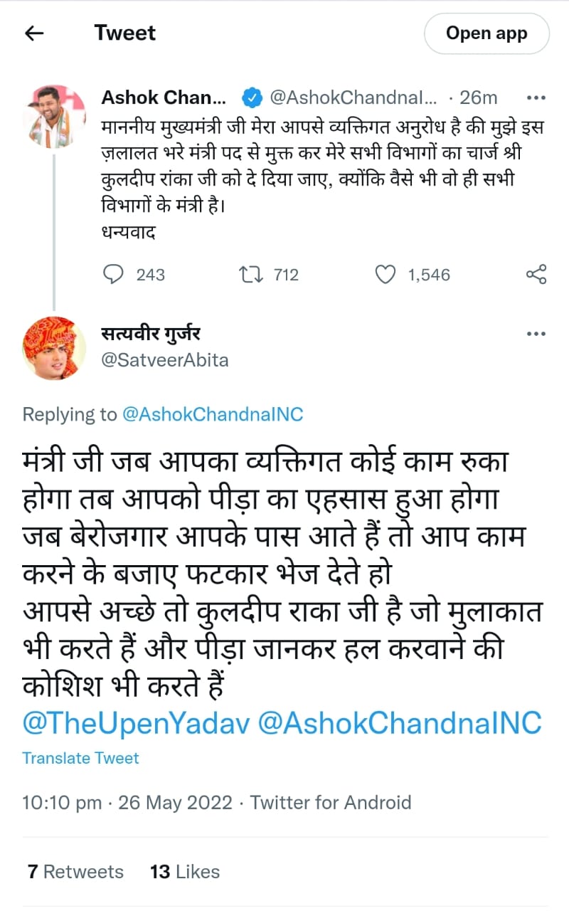 'मंत्री अशोक चांदना ने ट्वीट कर लिखा कि माननीय मुख्यमंत्री जी मेरा आपसे व्यक्तिगत अनुरोध है कि मुझे इस जलालत भरे मंत्री पद से मुक्त कर मेरे सभी विभागों का चार्ज श्री कुलदीप रांका जी को दे दिया जाए, क्योंकि वैसे भी वो ही सभी विभागों के मंत्री हैं। धन्यवाद'