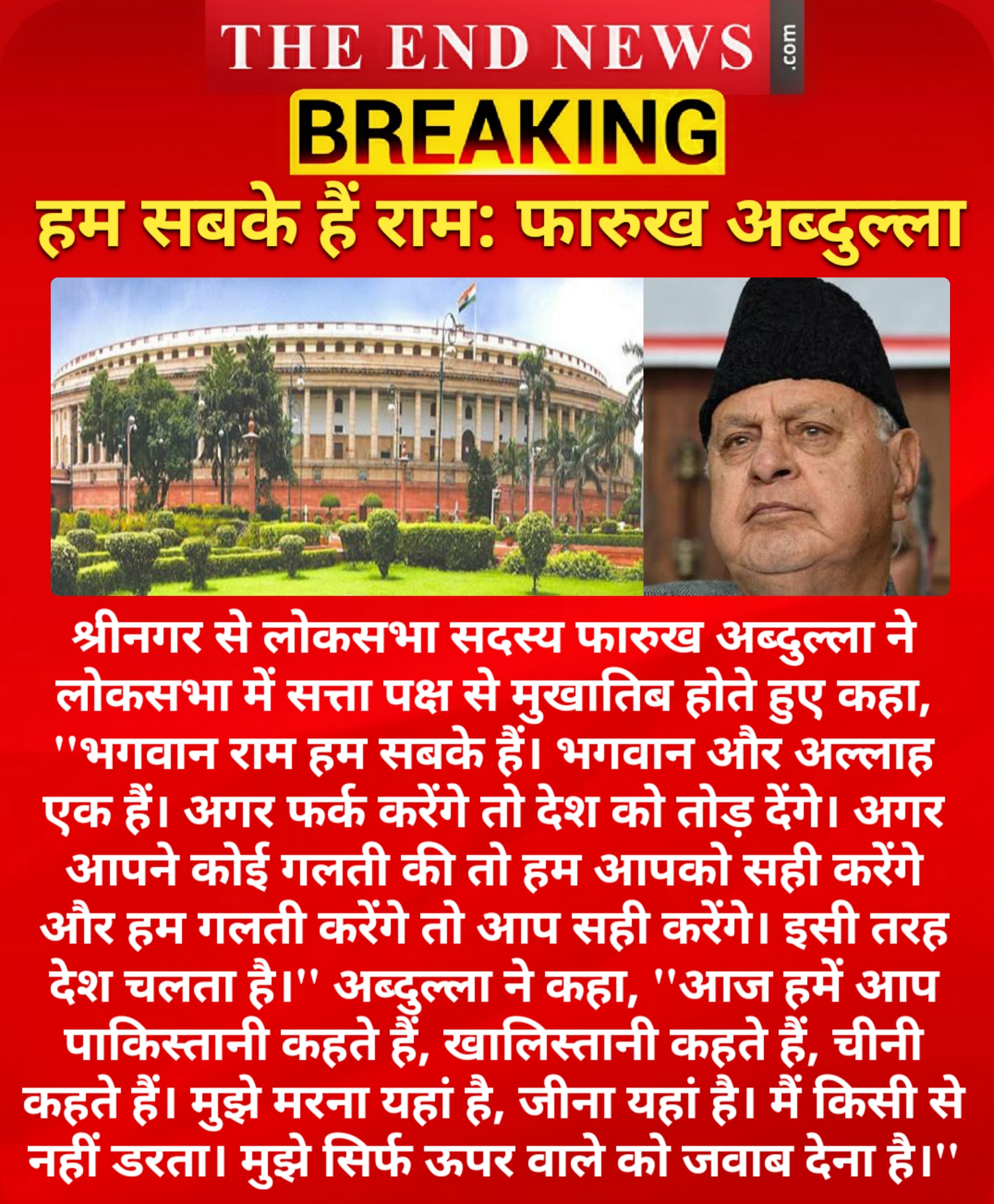 नई दिल्ली. नेशनल कॉन्फ्रेंस के नेता फारूक अब्दुल्ला का मंगलवार को लोकसभा में दिया गया बयान देशभर में चर्चा का विषय बना हुआ है. उन्होंने लोकसभा में राष्ट्रपति के अभिभाषण पर धन्यवाद प्रस्ताव पर चर्चा में शामिल होते हुए सरकार कोे जम्मू.कश्मीर के लोगों को दिल से लगाने और प्रदर्शनकारी किसानों को सुनने का आग्रह किया. और इस आग्रह के दौरान कहा कि भगवान राम हम सबके हैं और अगर अल्लाह एवं भगवान में फर्क किया गया तो यह देश टूट जाएगा. लोकसभा में राष्ट्रपति के अभिभाषण पर धन्यवाद प्रस्ताव पर बोलते हुए और सत्ता पक्ष से मुखातिब होते उन्होने कहा कि भगवान और अल्लाह एक हैं. अगर फर्क करेंगे तो देश को तोड़ देंगे. अगर आपने कोई गलती की तो हम आपको सही करेंगे और हम गलती करेंगे तो आप सही करेंगे. इसी तरह देश चलता है.